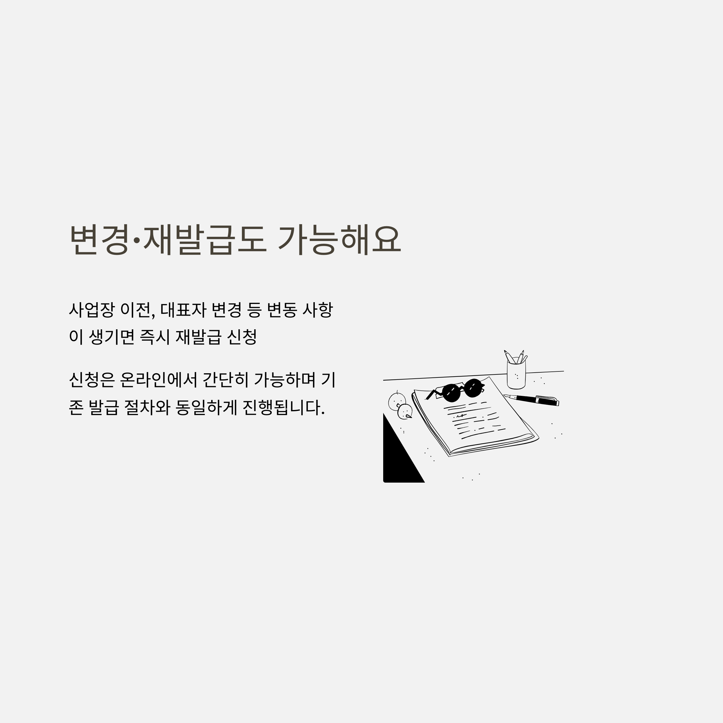 - 대표자 변경, 상호변경, 사업장 이전 등 정보 변경 시 즉시 재발급 신청