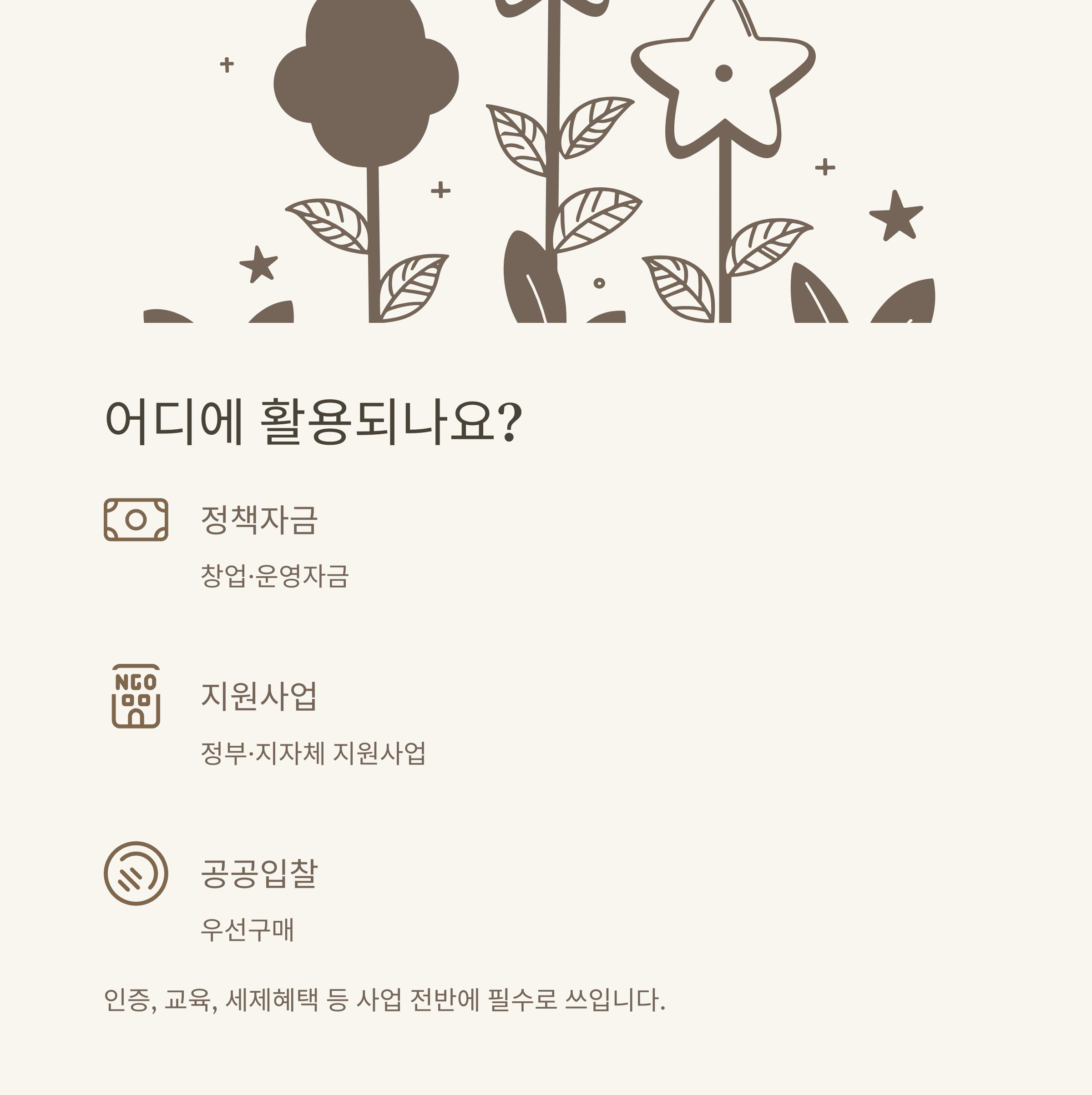 | 주요 활용처 | 정부지원사업, 정책자금, 입찰, 인증, 교육 등 |
