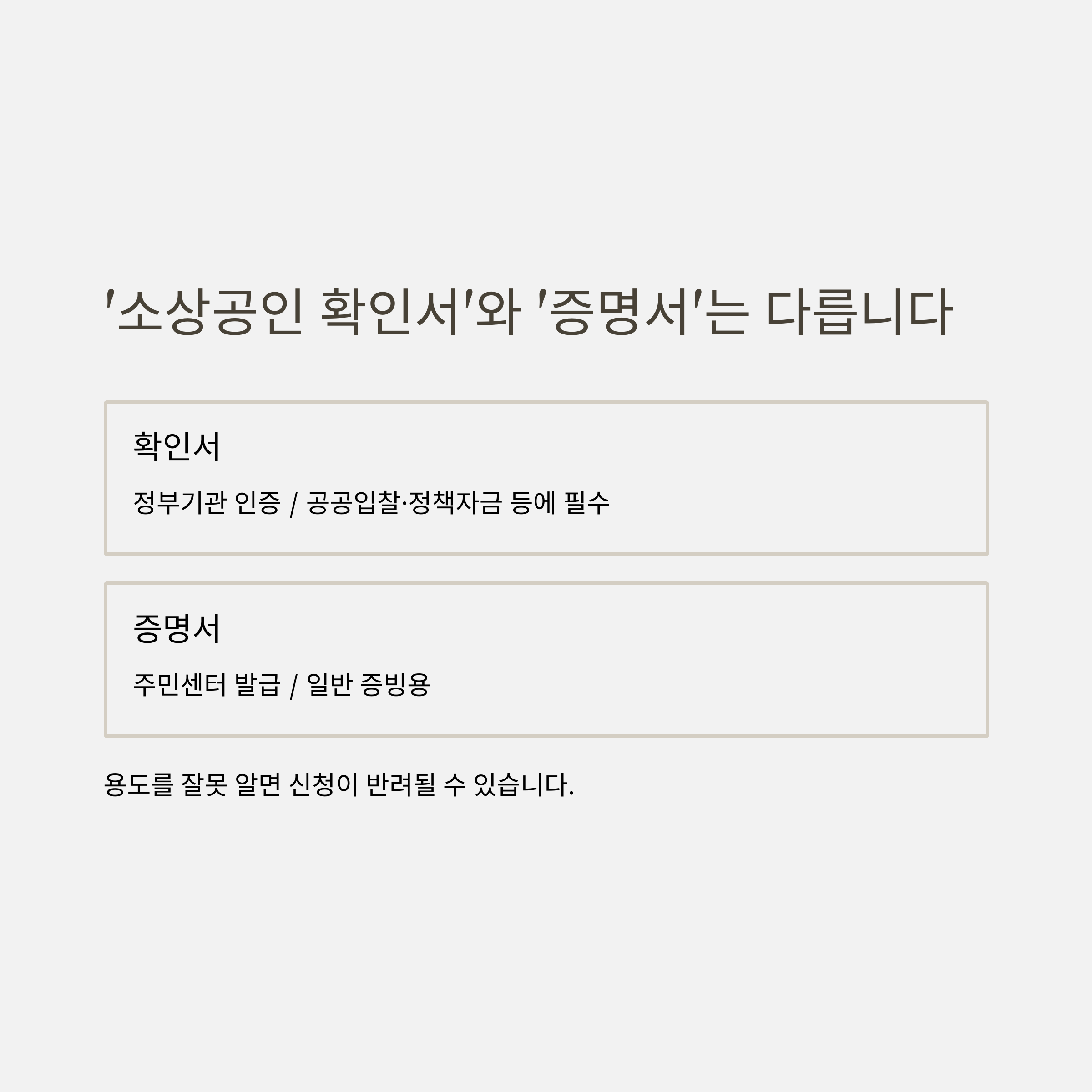 저는 실제로 소상공인 지원금 신청할 때 ‘확인서’가 필요한데, 증명서만 내서 서류 반려된 적이 있었습니다. 꼭 용도를 확인하고 발급 받으시길 권장합니다.