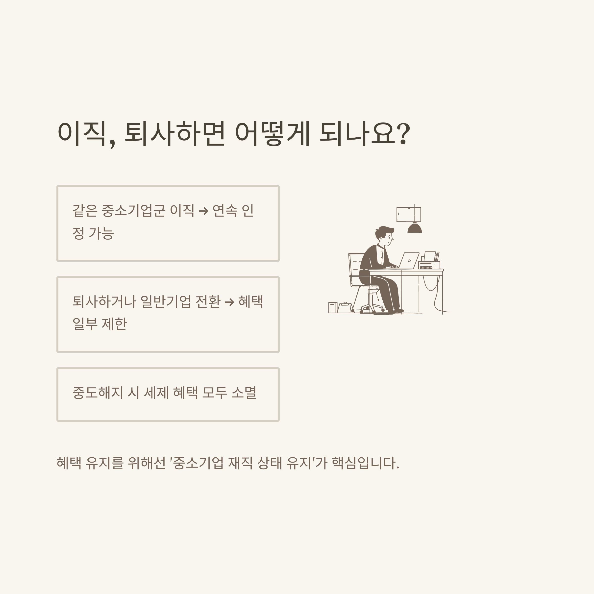 - 이직: 동일 중소기업군 이직 시 연속 인정(재직증명, 4대보험 계속납부 증빙 필요)