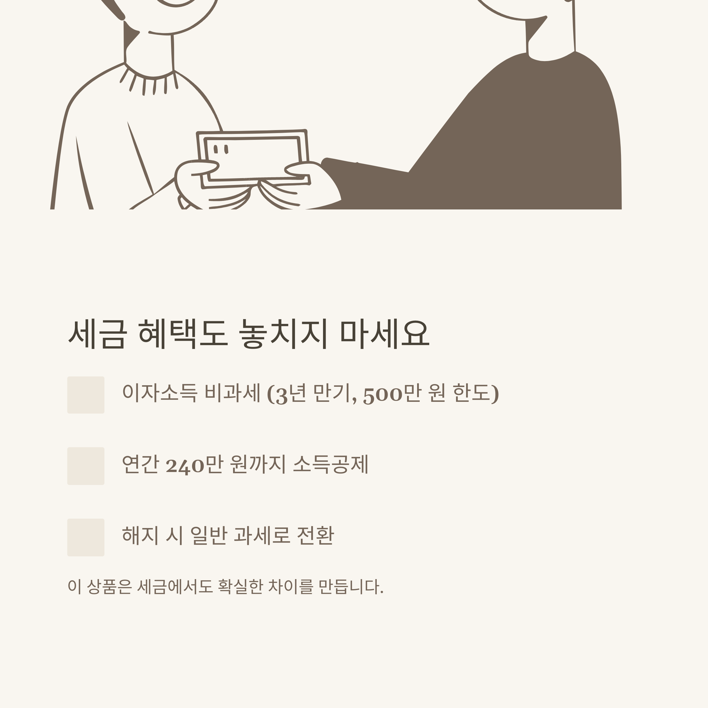 - 3년 이상 만기 유지 시 이자소득 비과세(500만 원 한도, 본인 1인당 기준)