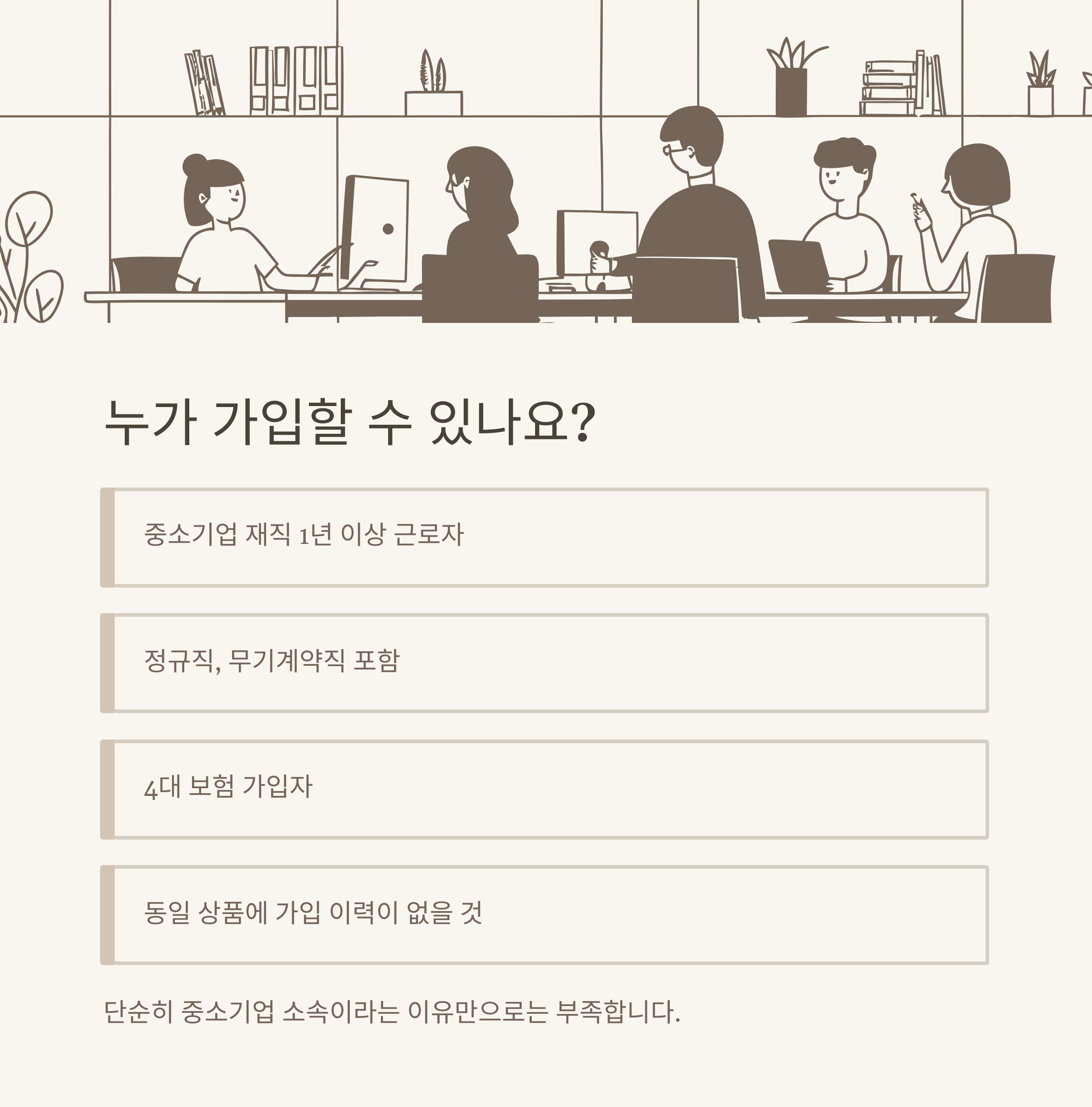 | 가입대상 | 중소기업 재직 1년 이상 근로자(정규직, 무기계약직 등) |