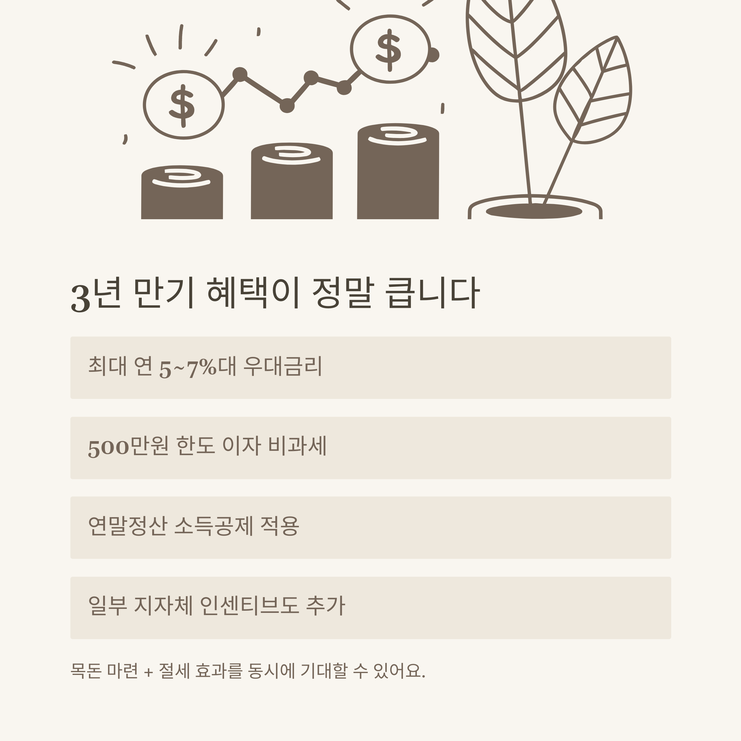 - 3년 만기 유지 시 이자소득 비과세(최대 3년간 500만원 한도)