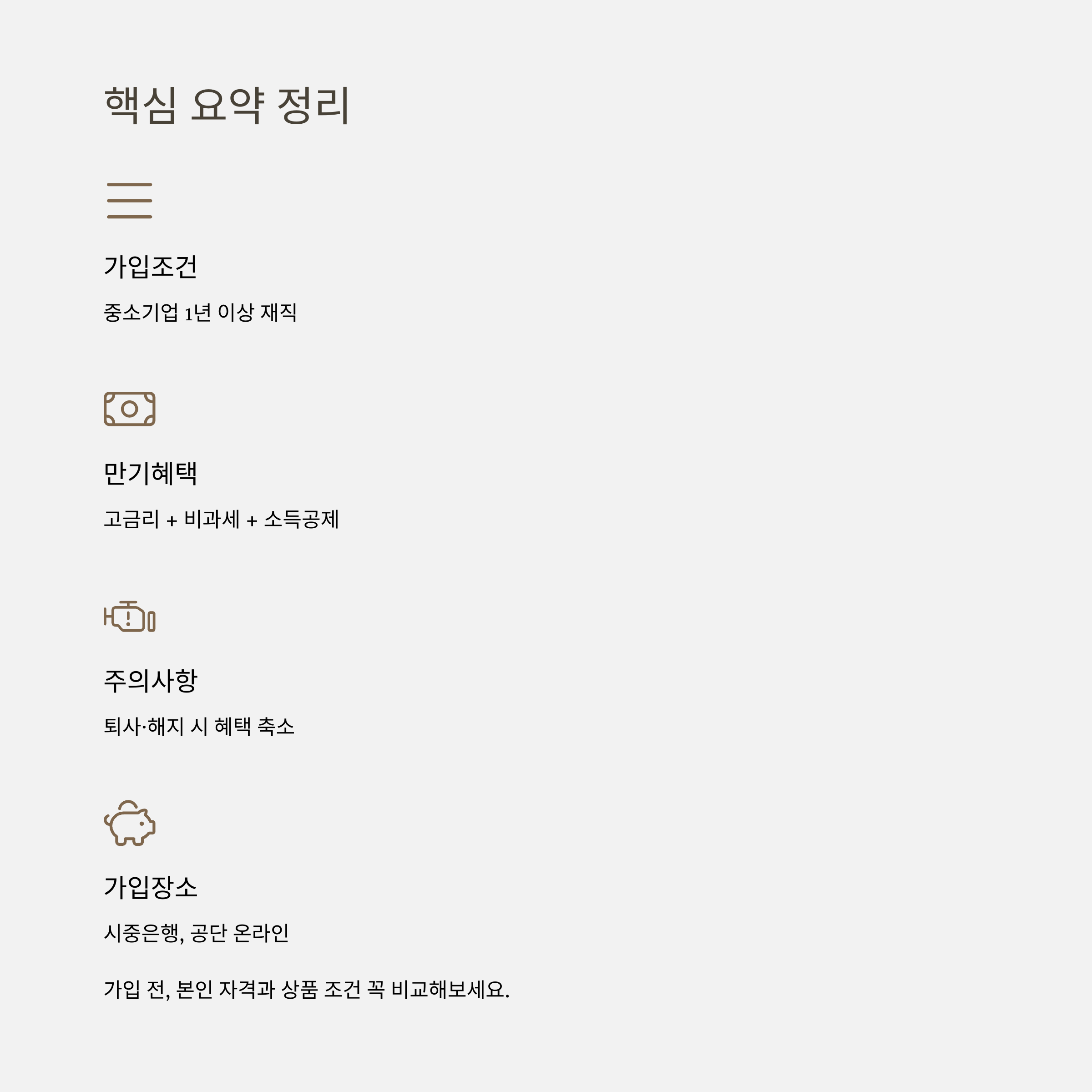 공식 만기혜택, 세제안내는 중소기업진흥공단에서 최신 기준으로 확인 가능합니다.