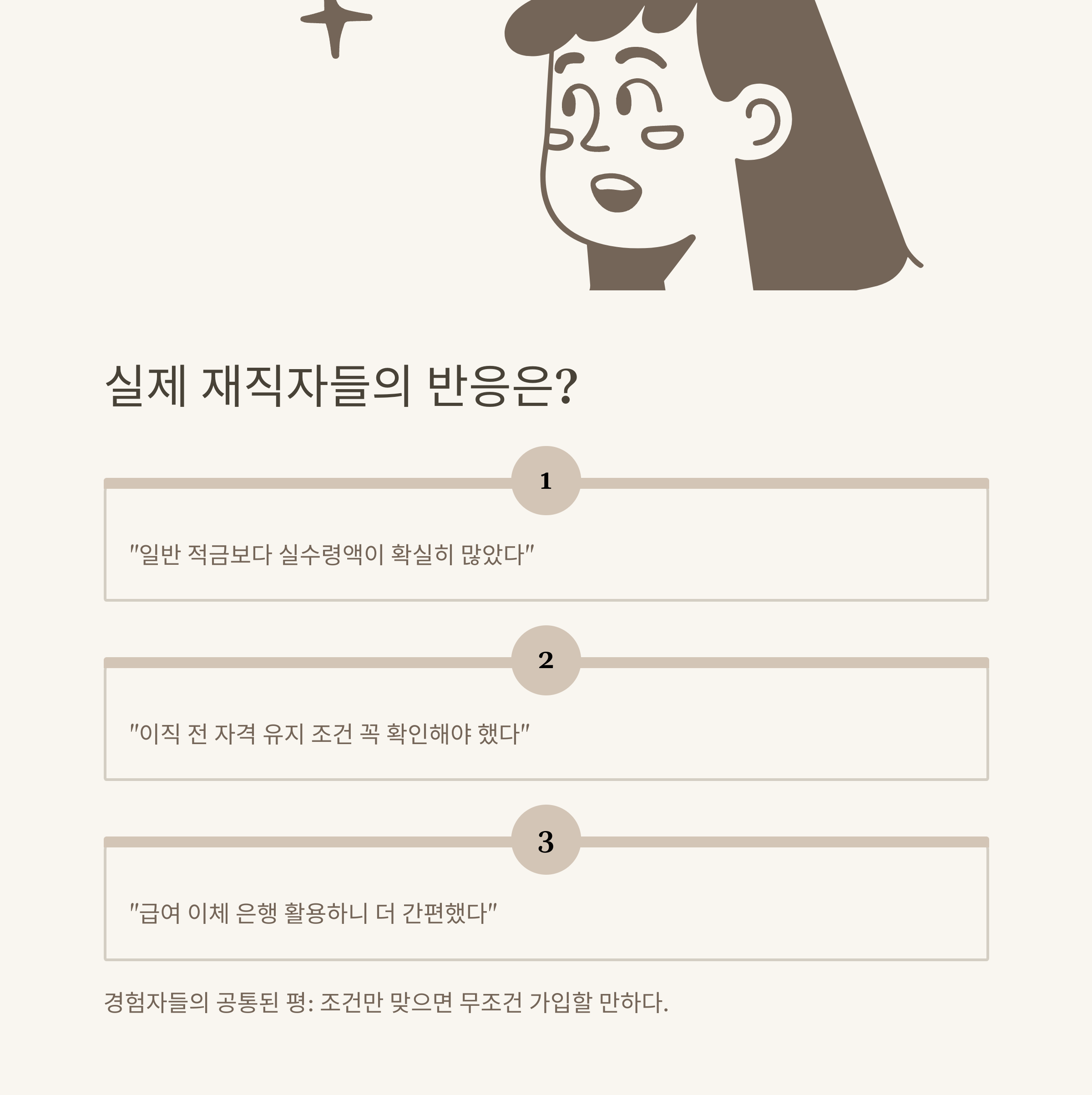 저도 이직 계획이 있을 때는 중도해지 조건과 연속 자격 요건을 꼼꼼하게 따져본 뒤 결정했습니다. 자세한 실전 사례는 공식 적금 활용 후기 게시판에서 확인 가능합니다.