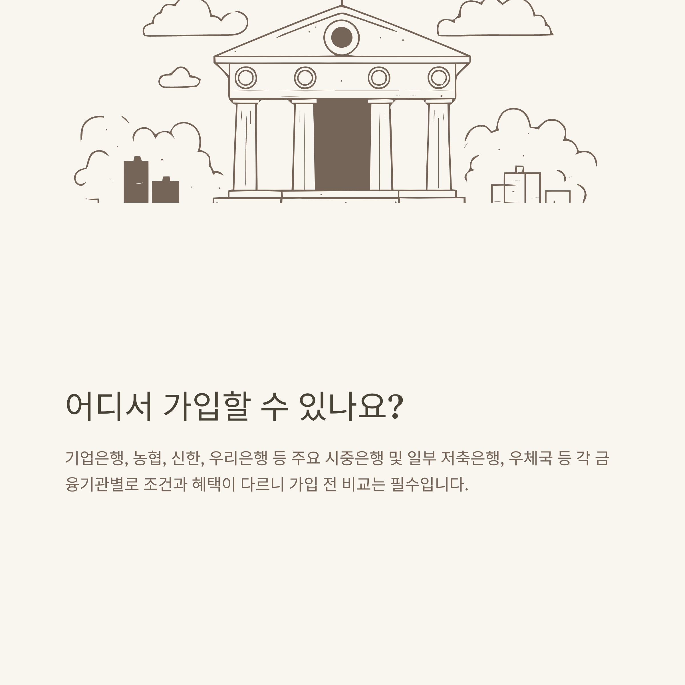 금융기관마다 금리, 가입조건, 납입한도, 부가서비스(예: 비과세 한도, 만기 자동연장 등)가 조금씩 다르니, 꼭 여러 군데 비교해보고 결정하는 것이 좋았습니다. 저의 경우 IBK기업은행에서 가입해봤고, 주변 동료 중엔 지방은행 특판상품을 이용해 더 높은 금리 혜택을 받은 사례도 있었습니다.