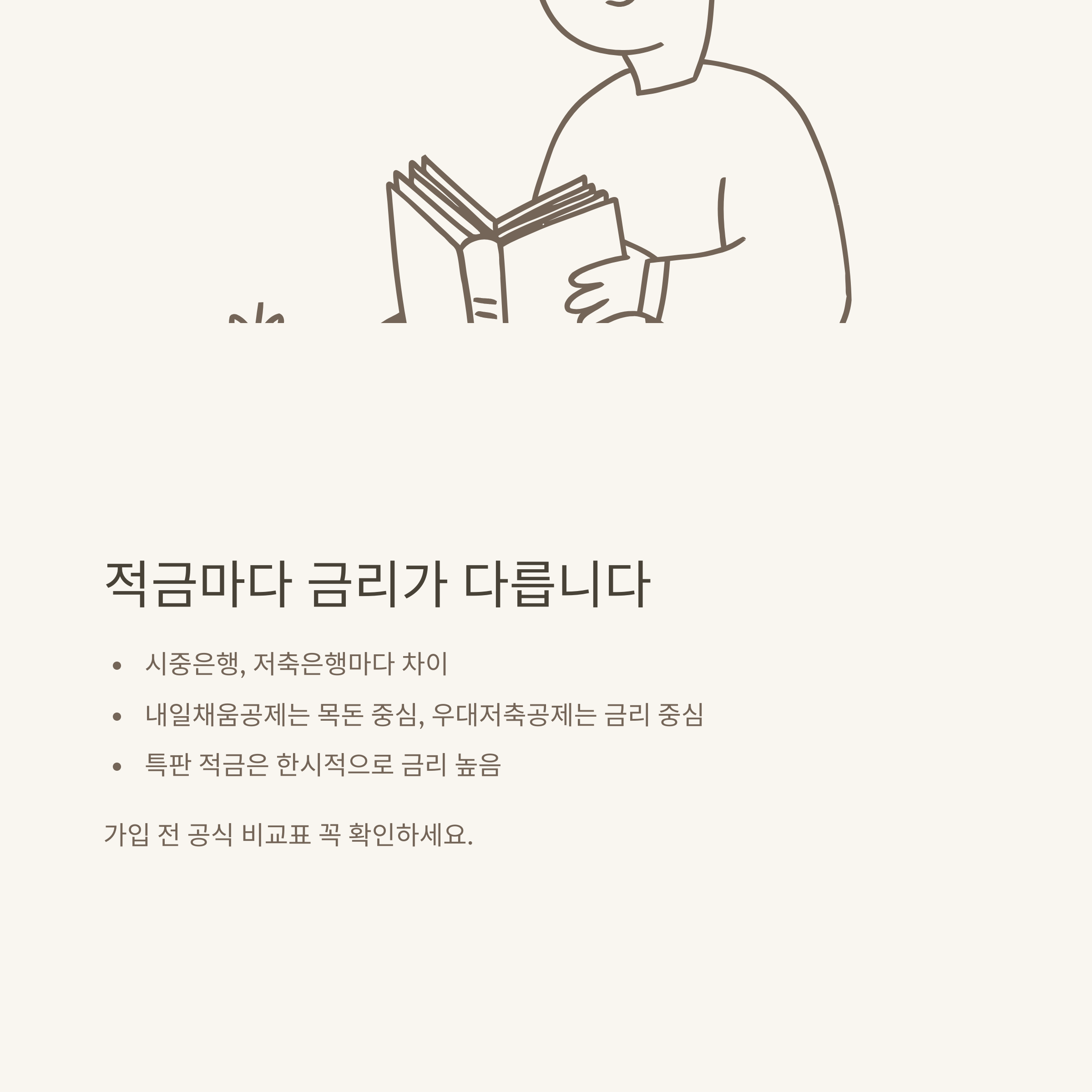 저는 기업은행, 우리은행, 농협 등 시중은행과 저축은행, 그리고 내일채움공제 등 정부지원상품까지 모두 금리표를 뽑아서 비교했었는데, 실제로 0.5~1%P 이상 차이가 나는 경우도 있었어요. 금리는 변동될 수 있으니 신청 전에 반드시 공식 안내를 다시 확인하세요.