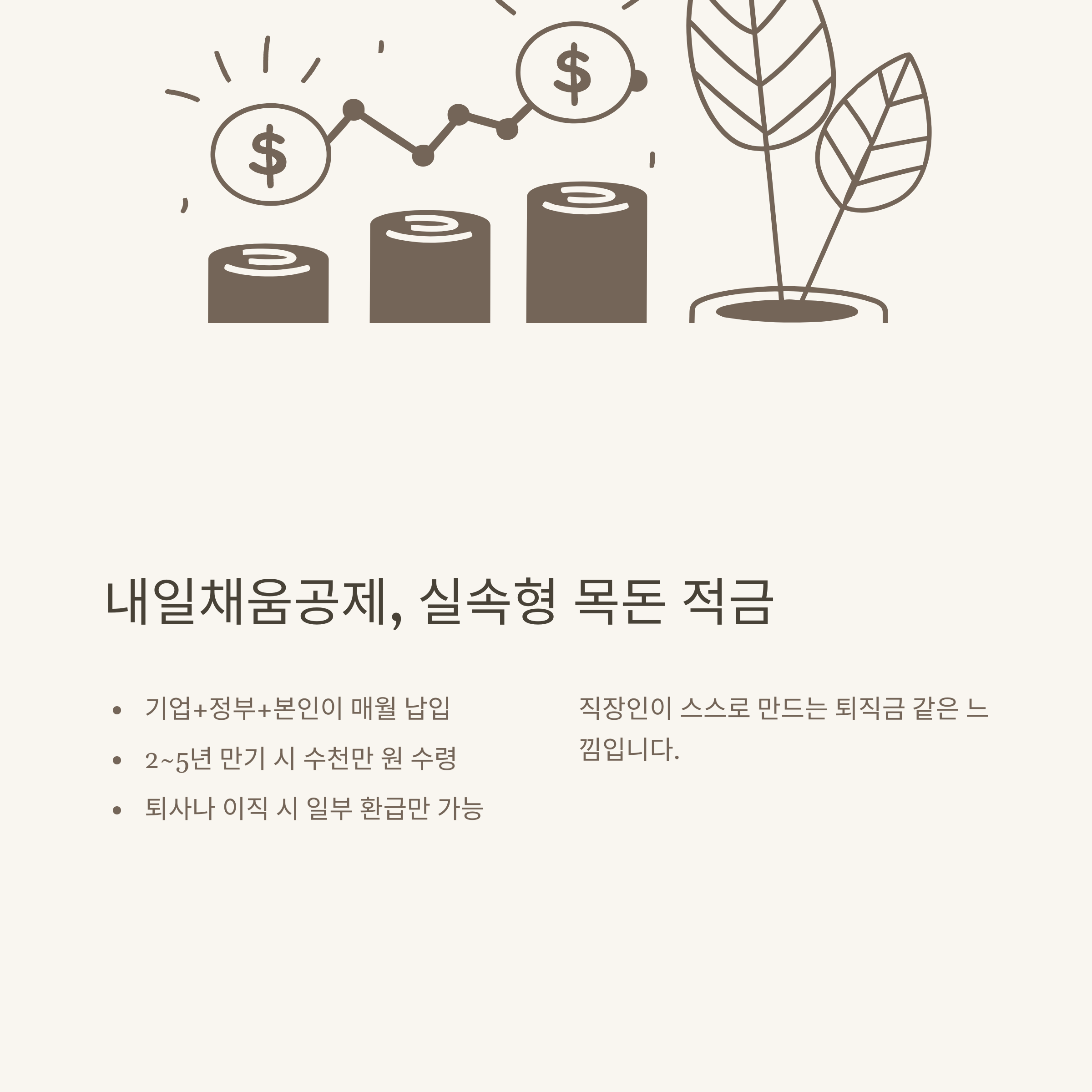 - 내일채움공제: 기업·정부·근로자가 함께 적립, 만기 시 목돈 수령