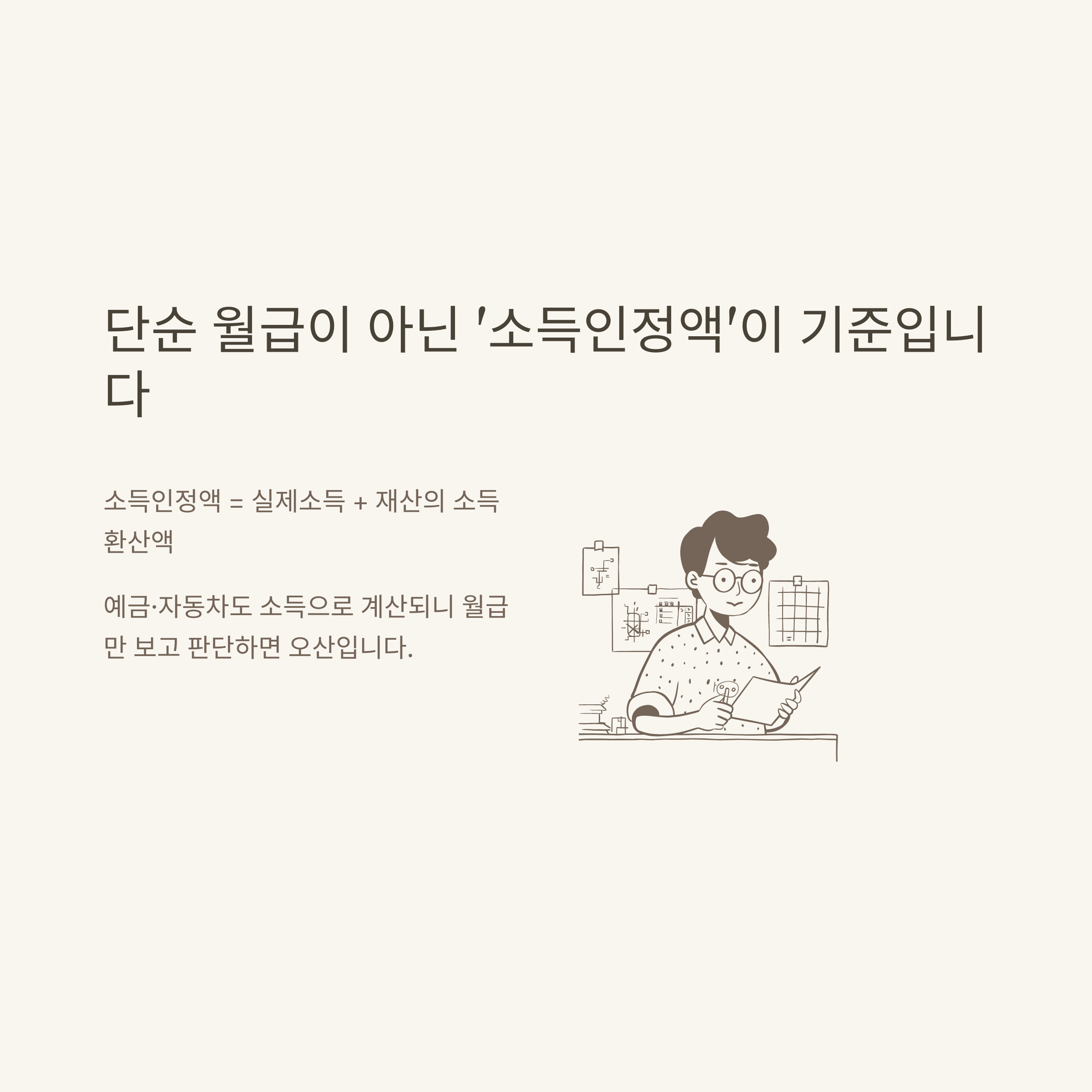 소득인정액은 실제 소득 + 재산의 소득환산액입니다. 재산(예: 예금, 자동차, 부동산 등)은 일정 비율로 환산해서 소득처럼 계산되기 때문에, 저축이 많거나 차량이 있으면 실제 월소득보다 높게 평가될 수 있어요.