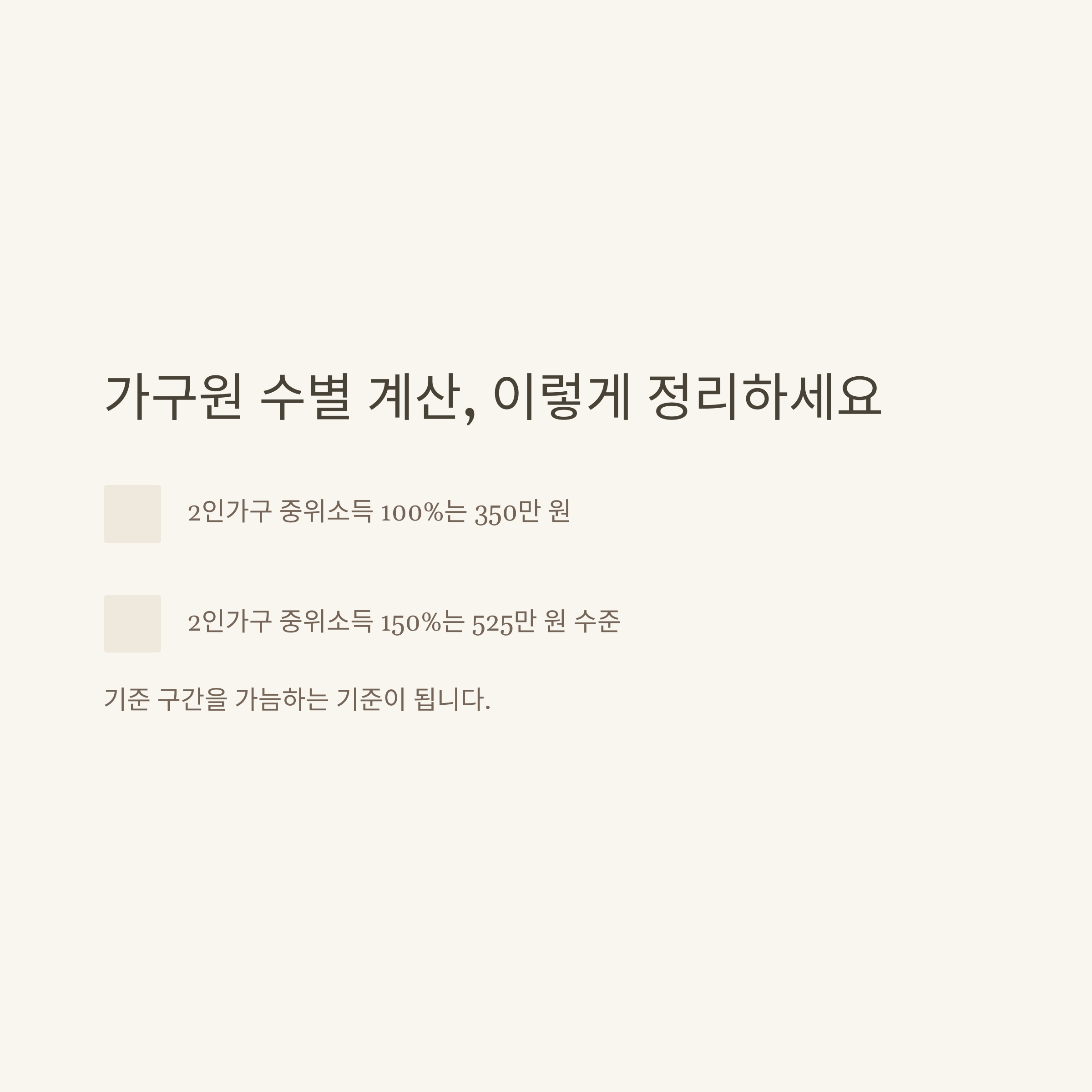 중위소득은 가구원 수에 따라 달라지기 때문에, 내가 어떤 기준에 해당하는지를 정확히 판단하려면 가구원 수에 맞는 수치를 알아야 합니다. 저는 3인 가구로 생계급여 대상 여부를 확인할 때, 중위소득 50%가 얼마인지 계산해보며 이 구조를 체감했어요.
