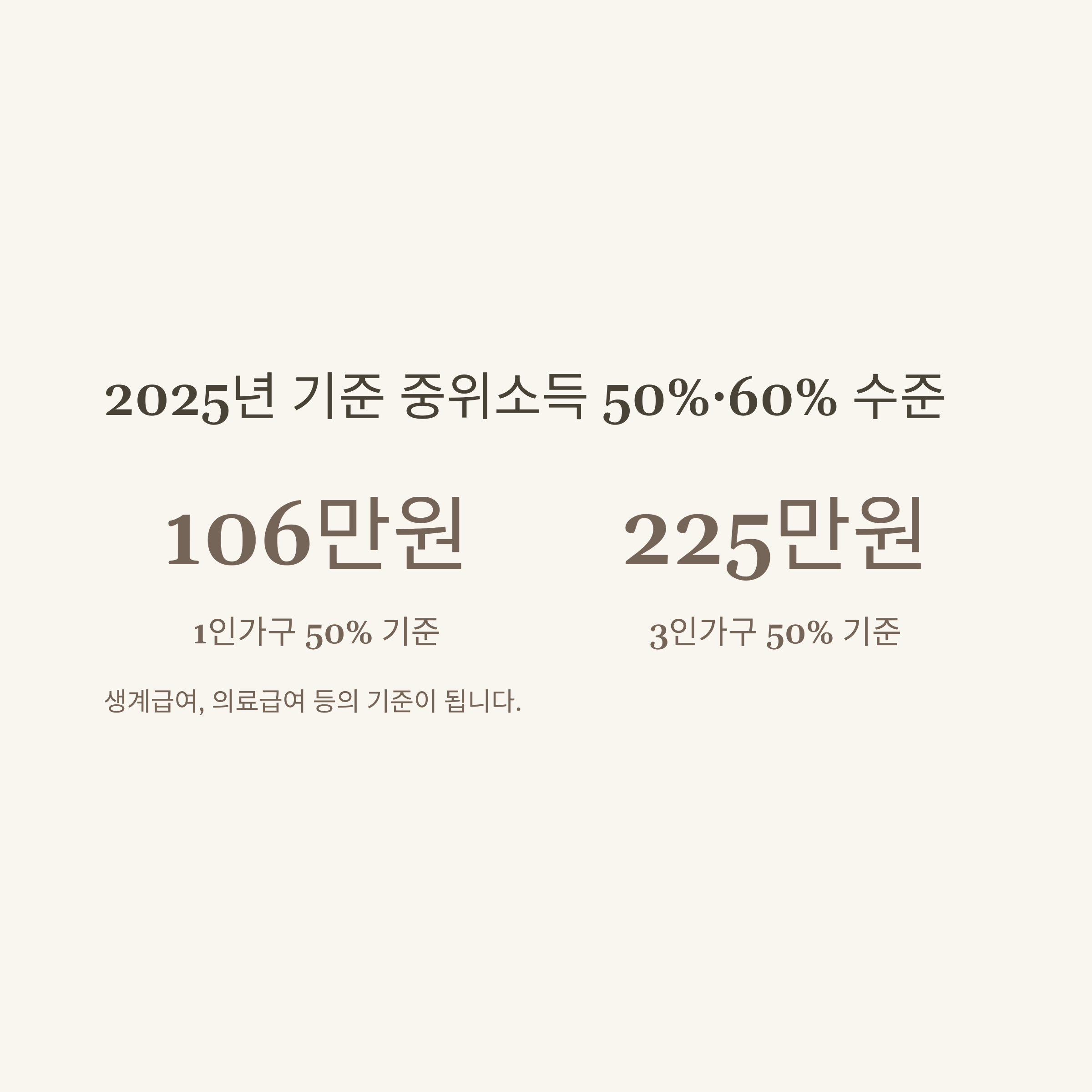 각종 복지제도(기초생활수급자, 차상위계층 등)는 이 기준을 기준으로 삼아 지급 여부를 결정합니다. 특히 50% 이하일 경우 생계급여 신청 자격에 해당할 수 있으니, 해당되시는 분은 꼭 확인해보시길 추천드립니다.