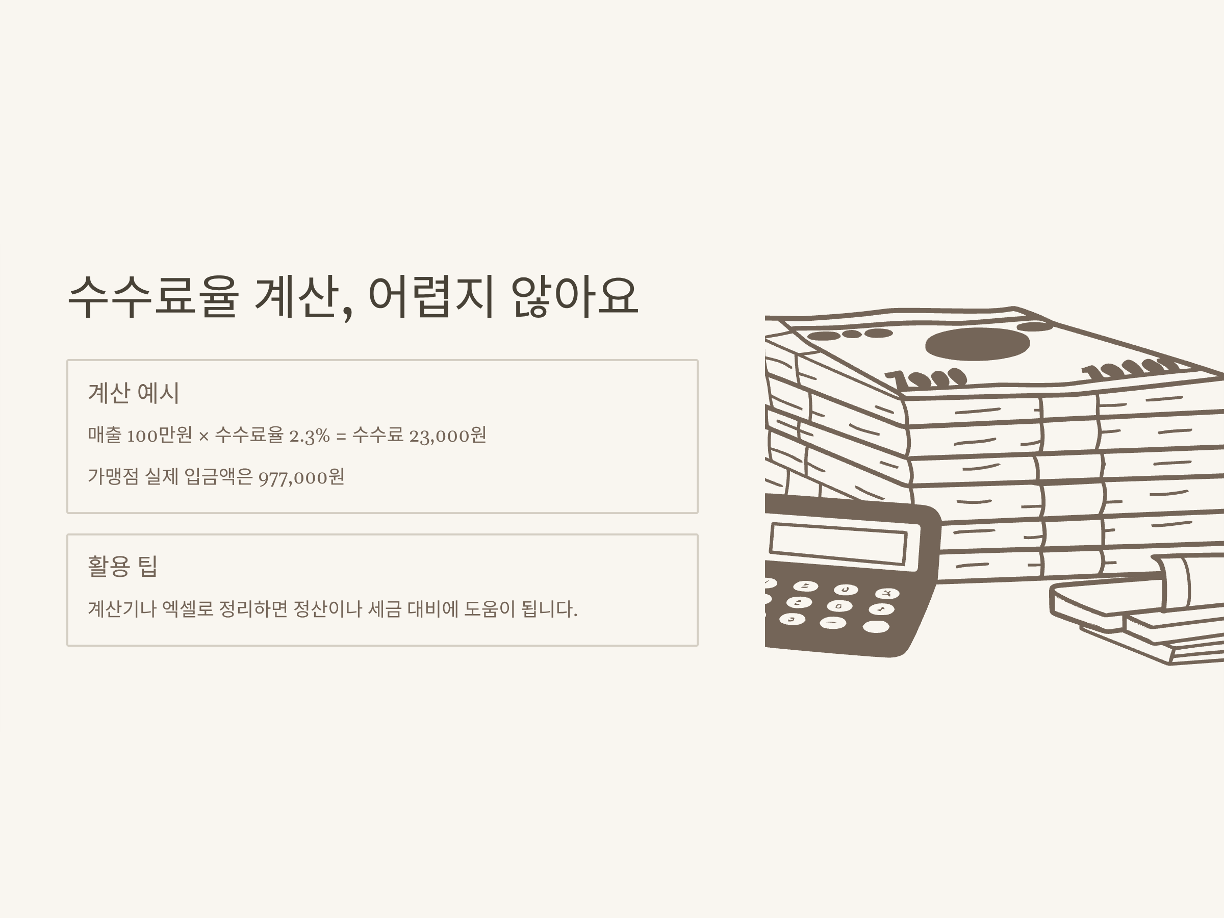 | 수수료율 계산법 | 총 매출 x 수수료율 = 수수료 금액 |