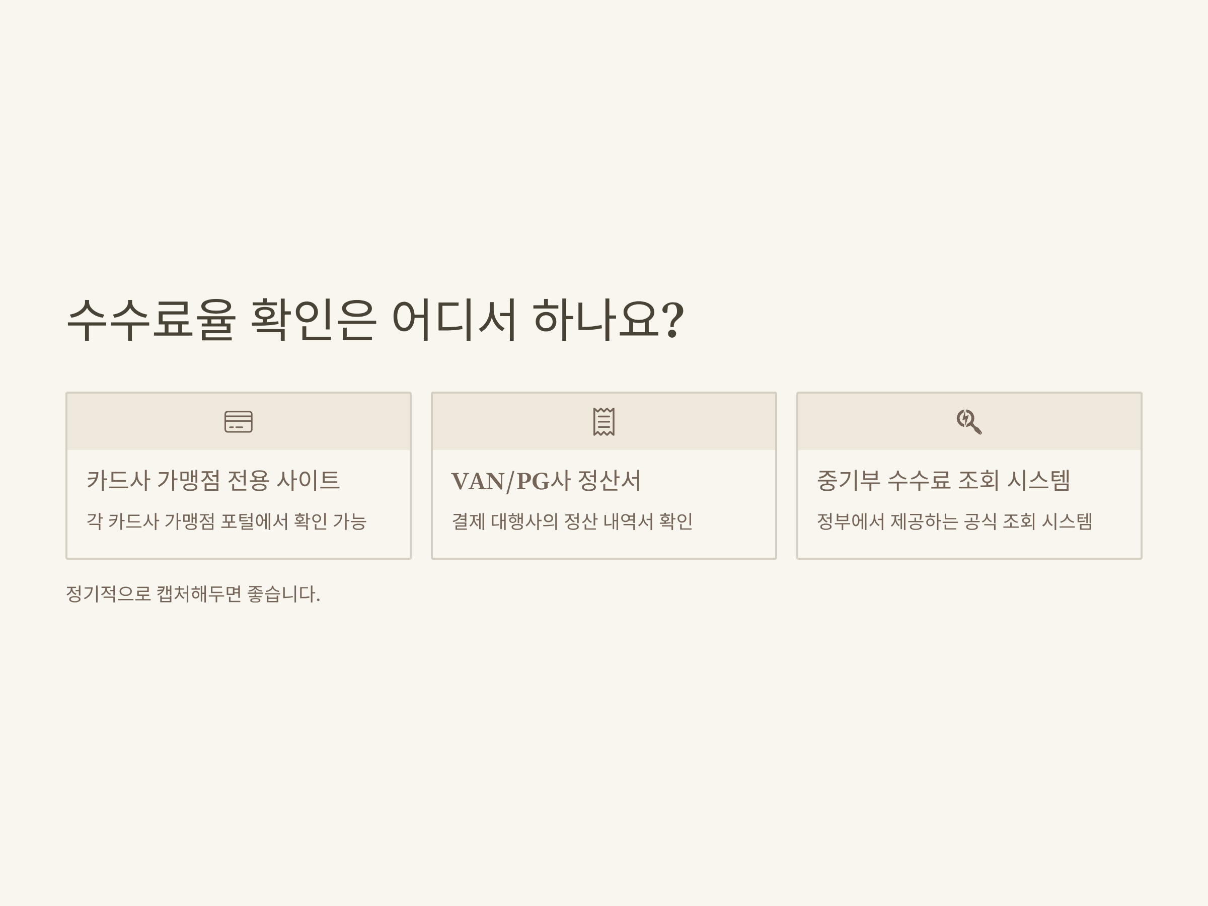 중요한 건, 가맹점주에게 사전 통보가 되지 않는 경우도 있다는 점입니다. 그래서 저는 분기마다 수수료율을 확인하고 캡처해두는 습관을 들였어요. 이런 대비가 없으면 불리한 수수료율을 모르고 그대로 적용받을 수 있으니까요. 전국은행연합회 카드 가맹점 수수료 확인 페이지에서 최신 수수료율 변동사항을 참고해 보시는 걸 추천드립니다.