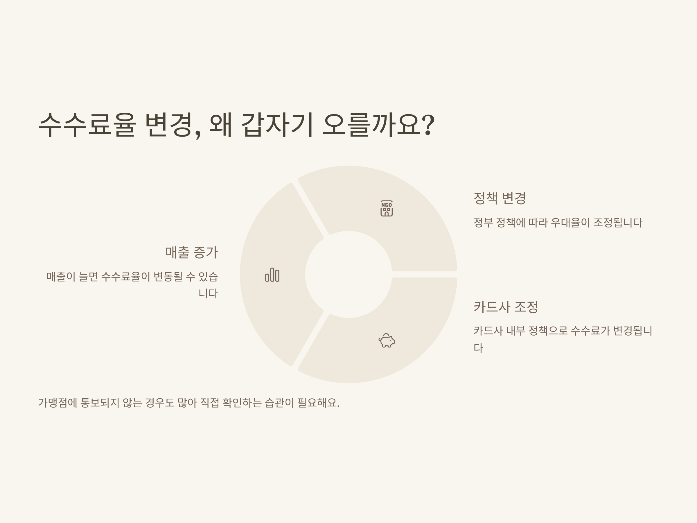 수수료율이 자동으로 바뀐다는 걸 처음 알았을 때, 저는 꽤 당황했어요. “계약서에 명시된 수수료가 그대로 유지되는 줄 알았는데 왜 올랐지?” 하고요. 알고 보니 매출 변동이나 정책 개편으로 인해 주기적으로 수수료율이 조정되는 구조였습니다. 카드 수수료율 변경은 다음과 같은 이유로 발생할 수 있습니다: