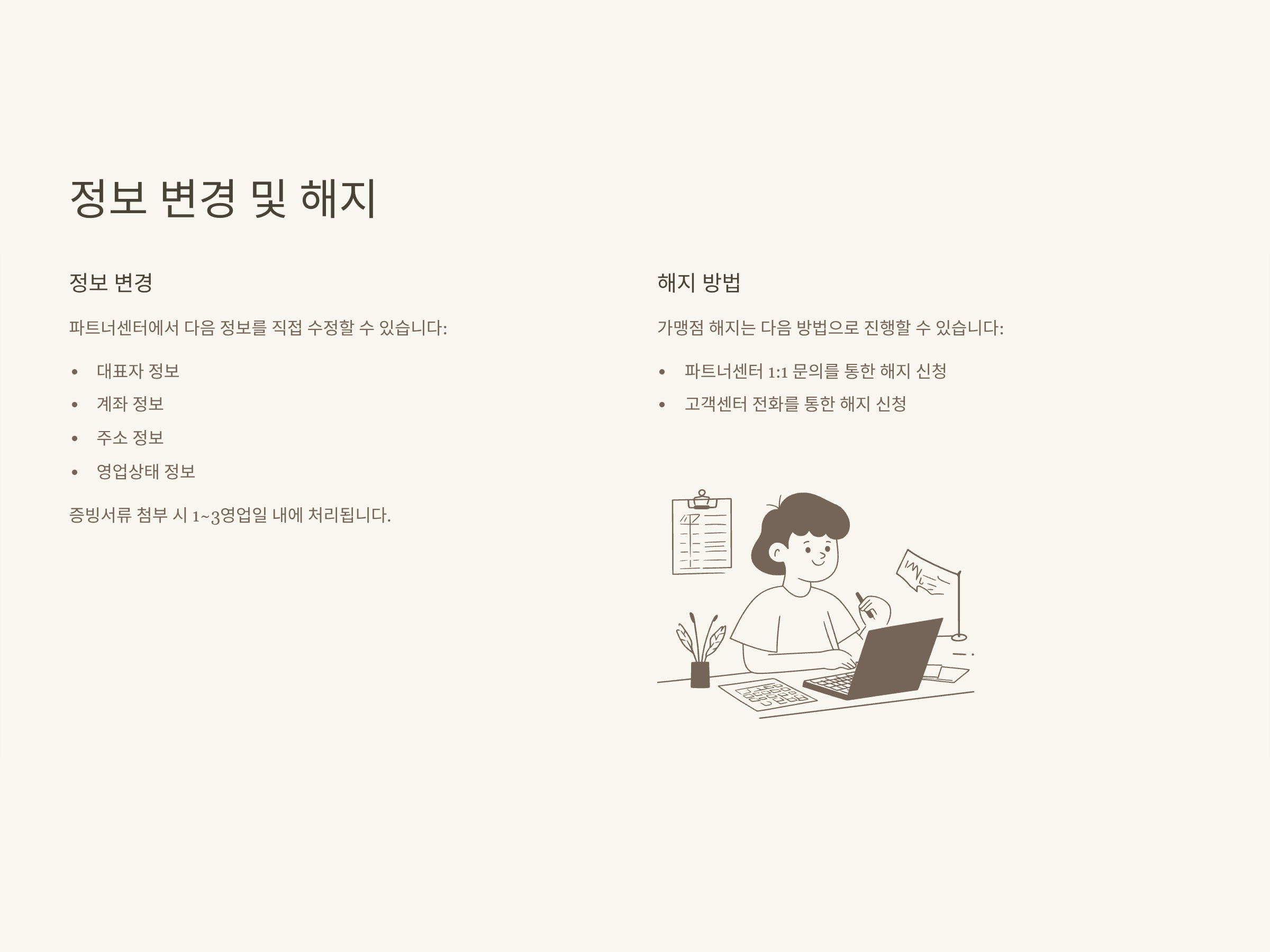 | 정보변경/해지 | 파트너센터 직접 관리, 1:1문의 지원 |