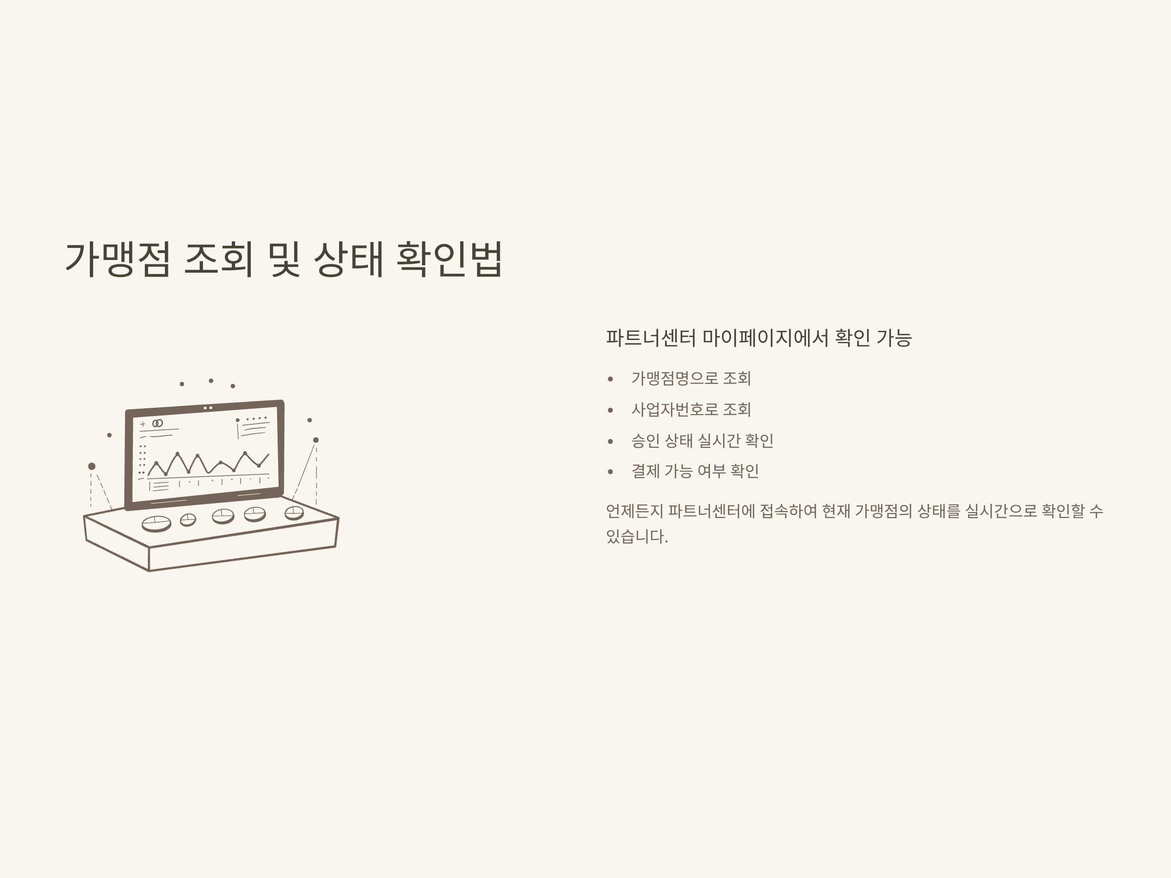 가맹점 신청 후, 제대로 등록이 되었는지 확인하는 과정이 필요합니다. 저도 승인 결과를 문자로 받았지만, 실제로 결제 시스템에 등록됐는지 직접 확인해보고 싶어서 ‘카카오페이 파트너센터’에서 내 가맹점 상태를 조회해봤어요. 마이페이지에서 내 매장명, 승인상태, 결제방식 등 상세 정보를 바로 확인할 수 있습니다.