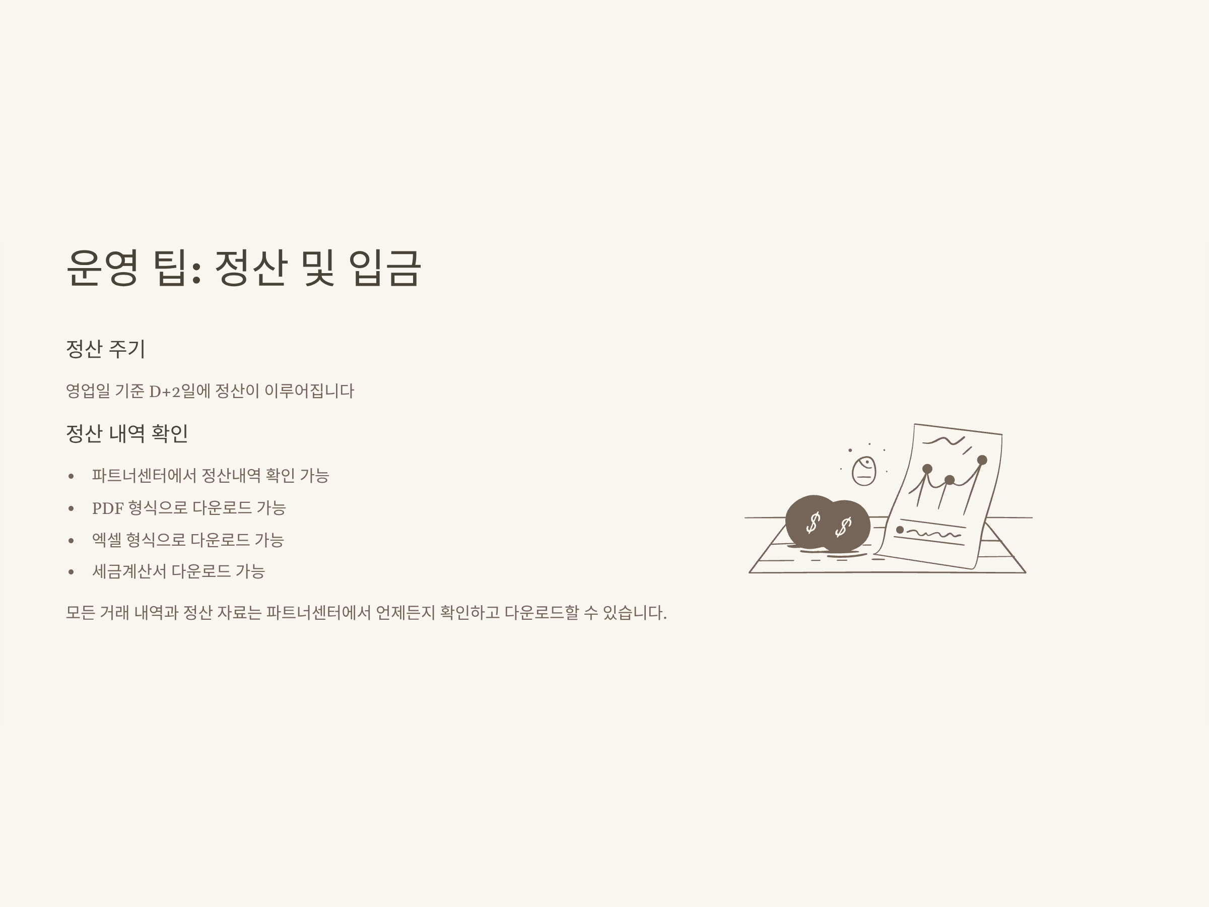 - 정산 내역은 파트너센터에서 PDF·엑셀 등으로 다운로드 가능