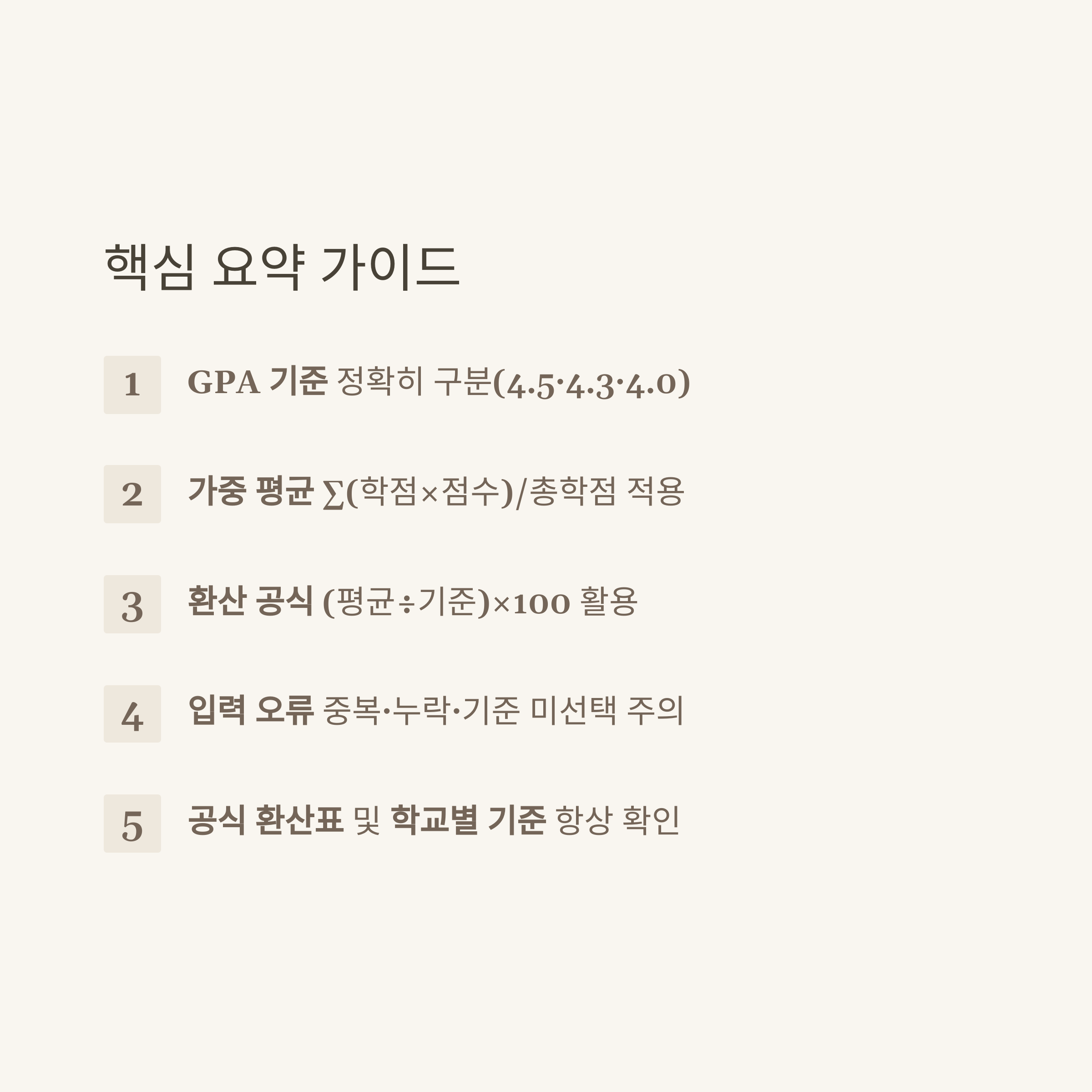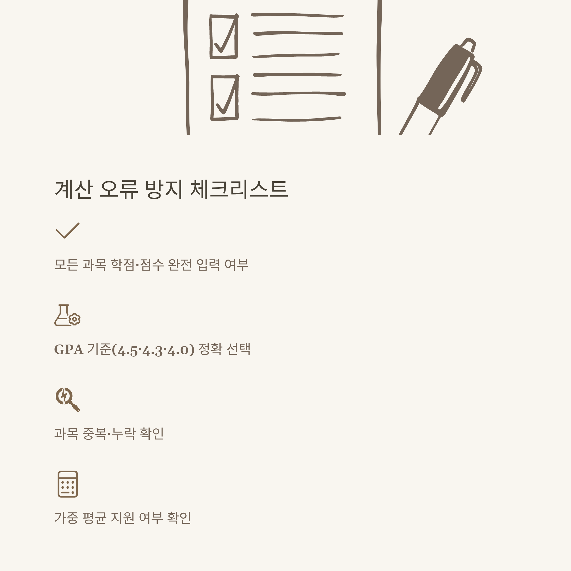 학점계산기를 쓰면서 가장 조심해야 할 게 바로 입력 실수예요. 저도 성적 하나를 잘못 입력해서 전체 백분율 평균이 5점 이상 차이 났던 적이 있어요. 그 뒤로는 매번 이 체크리스트를 보면서 입력을 하고 있어요.