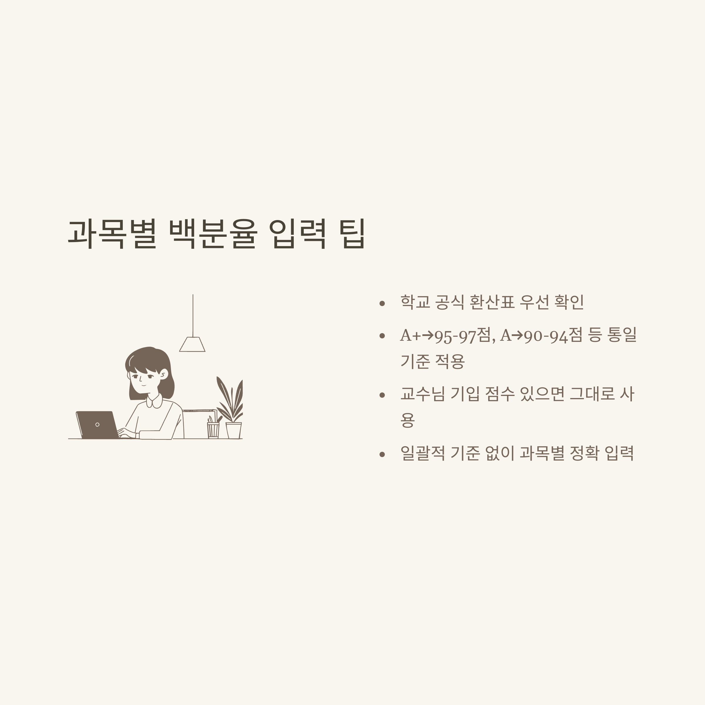 과목별 백분율 입력 시 유의할 점은 다음과 같아요: