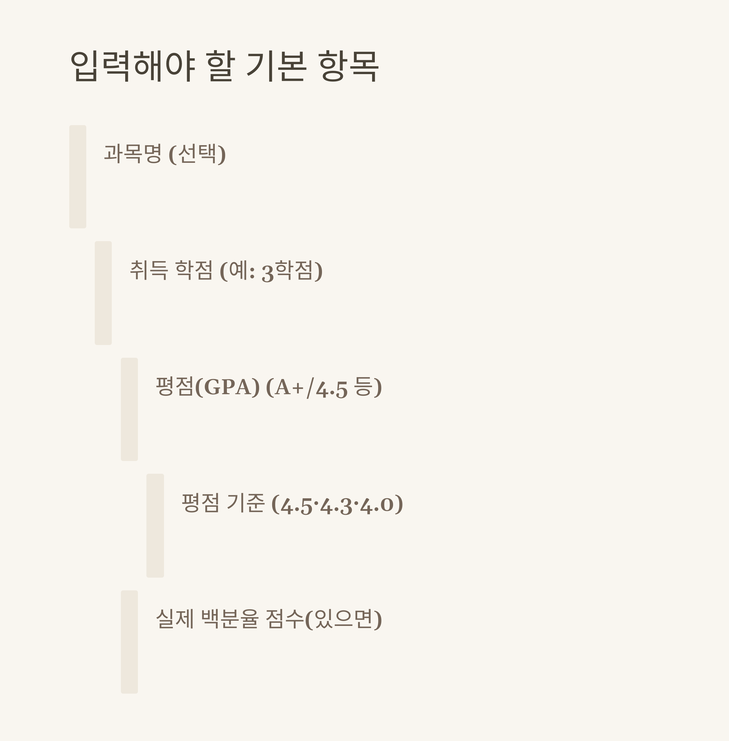 처음 학점계산기를 사용할 때 어떤 값을 입력해야 할지 막막했는데, 몇 번 써보니까 요령이 생기더라고요. 백분율 변환을 위해선 단순히 학점만 입력하는 게 아니라 과목별 정보와 이수 학점까지 꼼꼼히 넣어야 정확한 결과가 나옵니다.