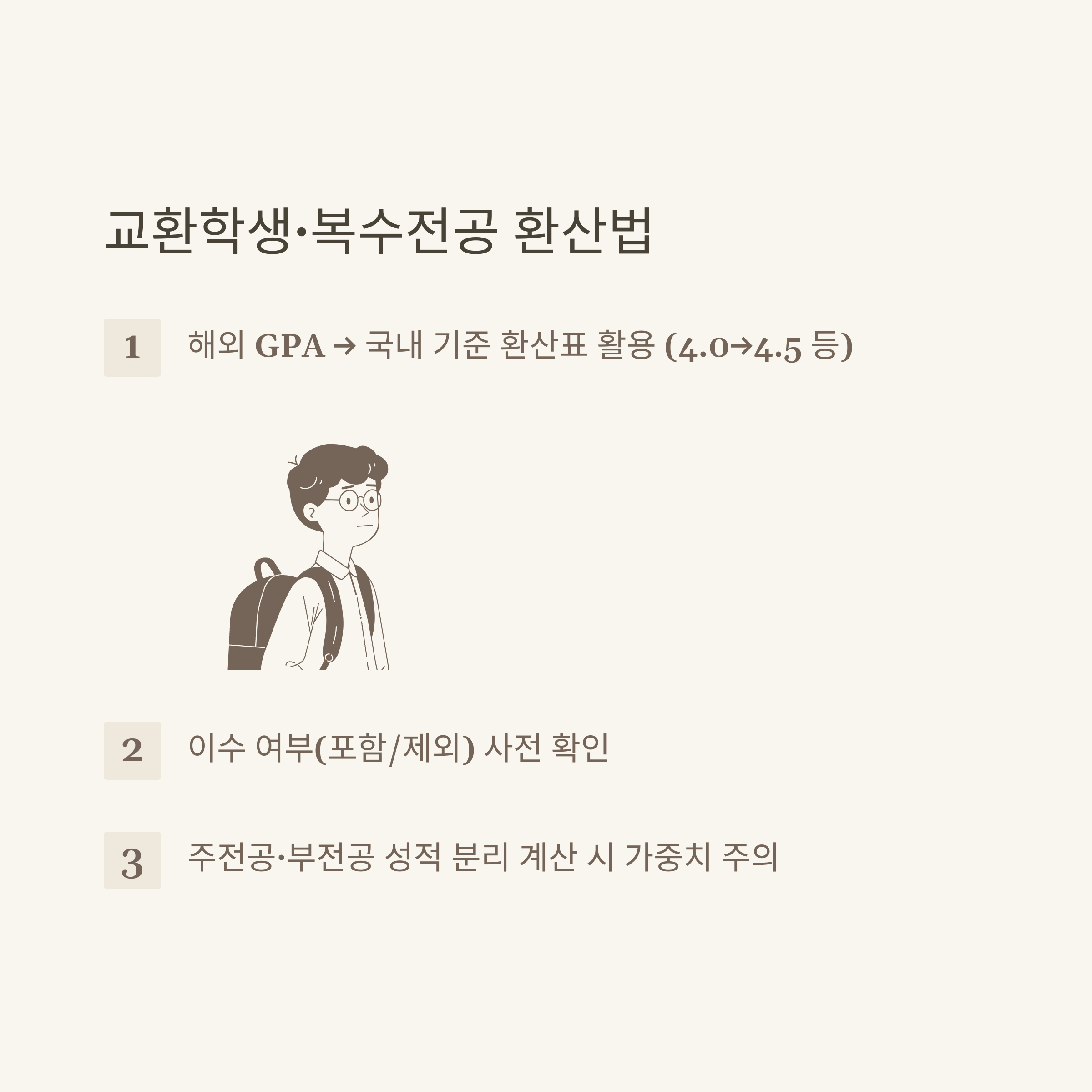 교환학생 또는 복수전공 포함 계산 시 팁은 아래와 같습니다: