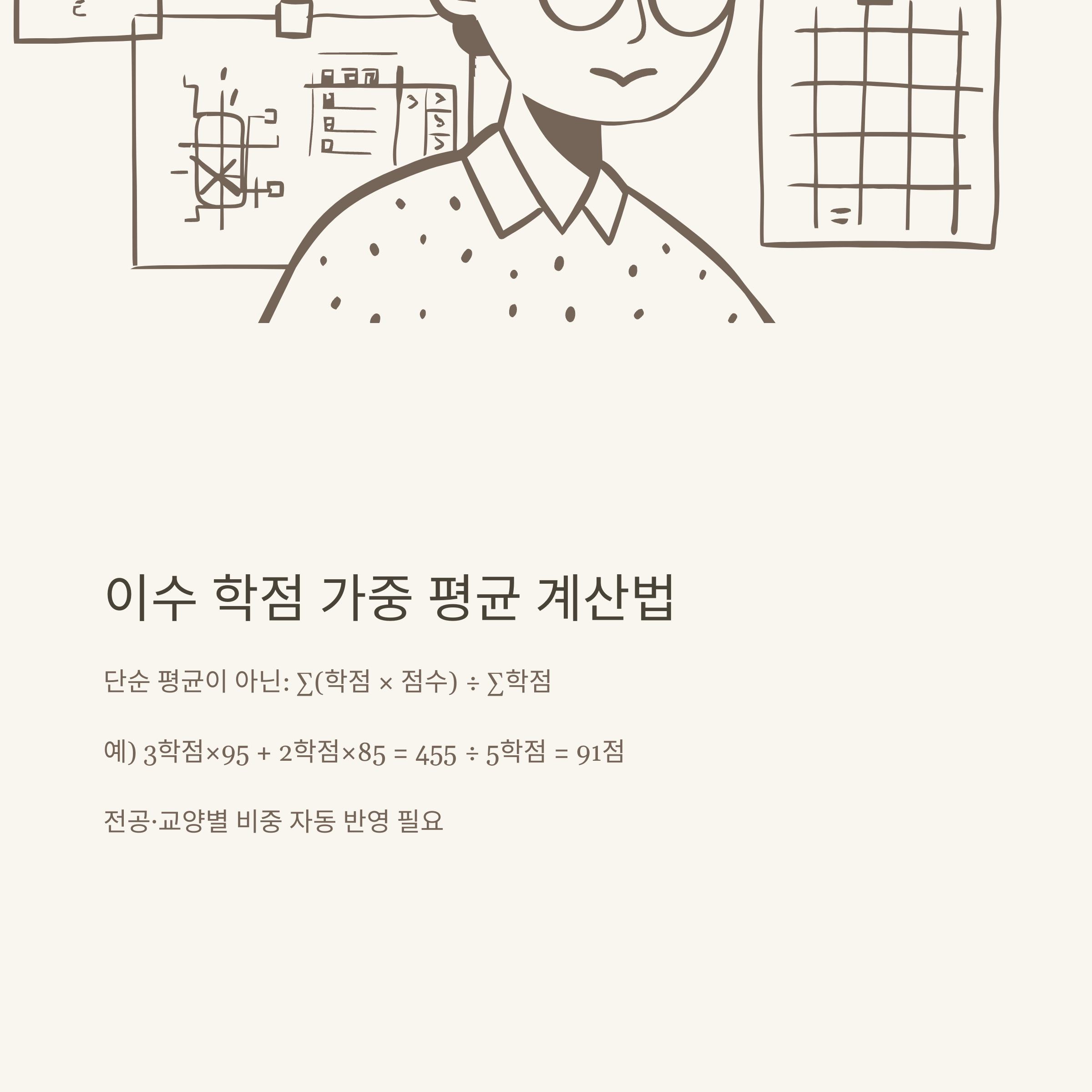 특히 복수전공, 부전공, 교양필수 등 다양한 분류의 과목이 존재하는 경우, 이수 학점 기준이 단순 평균이 아닌 ‘가중 평균’으로 계산되어야 정확한 결과가 나옵니다.