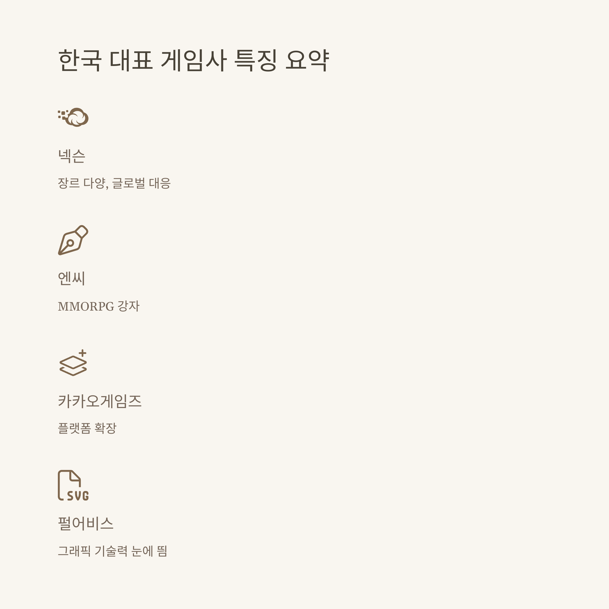 카카오게임즈는 모바일과 PC 플랫폼을 아우르는 전략적 행보가 인상적이며, 펄어비스는 기술력과 그래픽 퀄리티 면에서 눈에 띄는 발전을 보이고 있습니다. 이들의 순위는 단순 매출뿐 아니라 게임 출시 빈도, 이용자 수, 해외 진출 성과 등이 복합적으로 반영된 결과입니다.