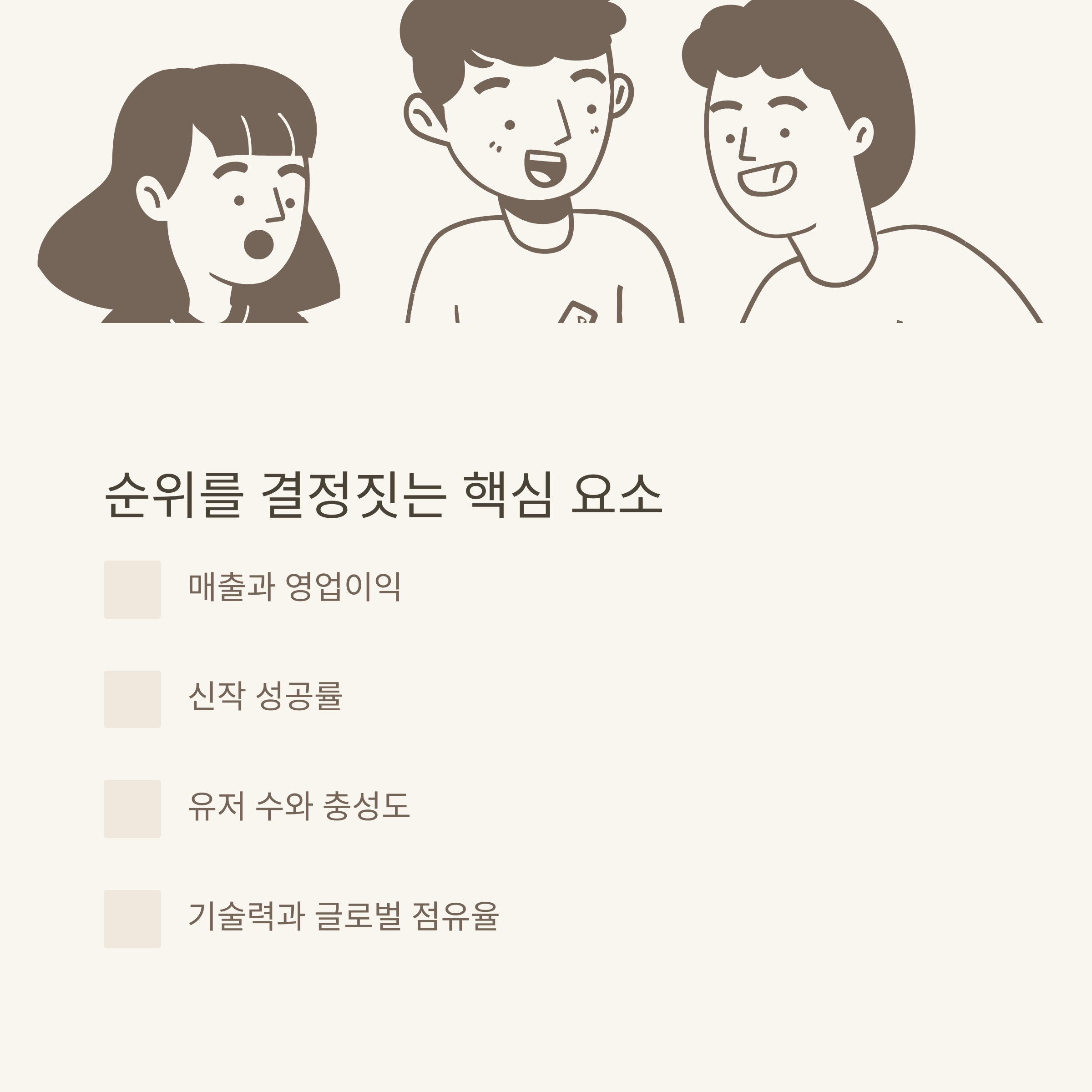 게임회사 순위는 단순히 매출액뿐 아니라 여러 가지 요소가 복합적으로 작용합니다. 제가 게임업계 소식을 꾸준히 접하면서 확인한 대표적인 영향 요소는 다음과 같습니다.