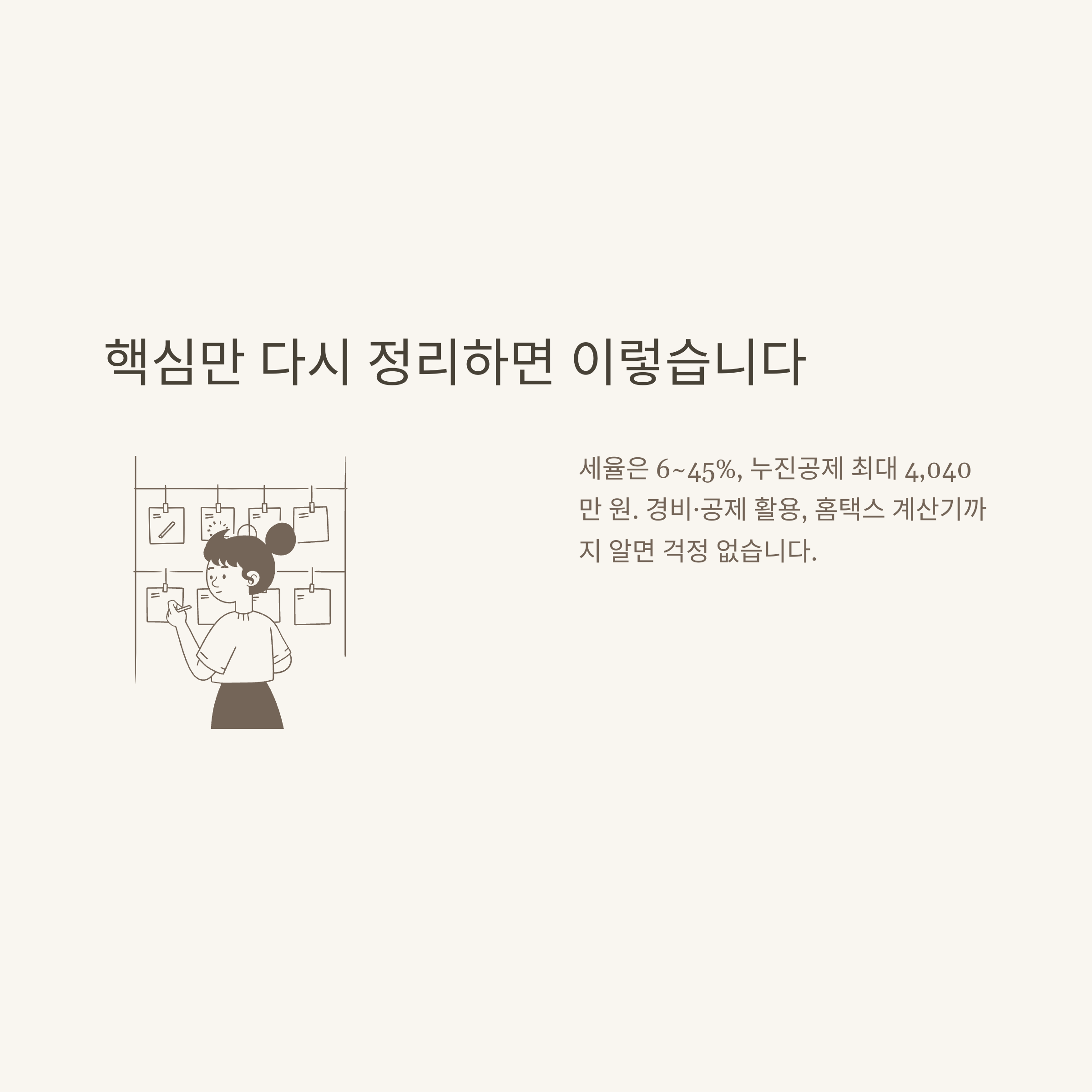 이렇게 세액을 계산할 땐 누진공제를 반드시 포함시켜야 실제 납부세액이 정확하게 나옵니다. 단순 세율만 적용하면 실제보다 훨씬 많은 세금을 추정하게 되는 오류가 생길 수 있어요. 세무사들도 누진공제를 빠뜨리지 않도록 가장 먼저 체크하더라고요.