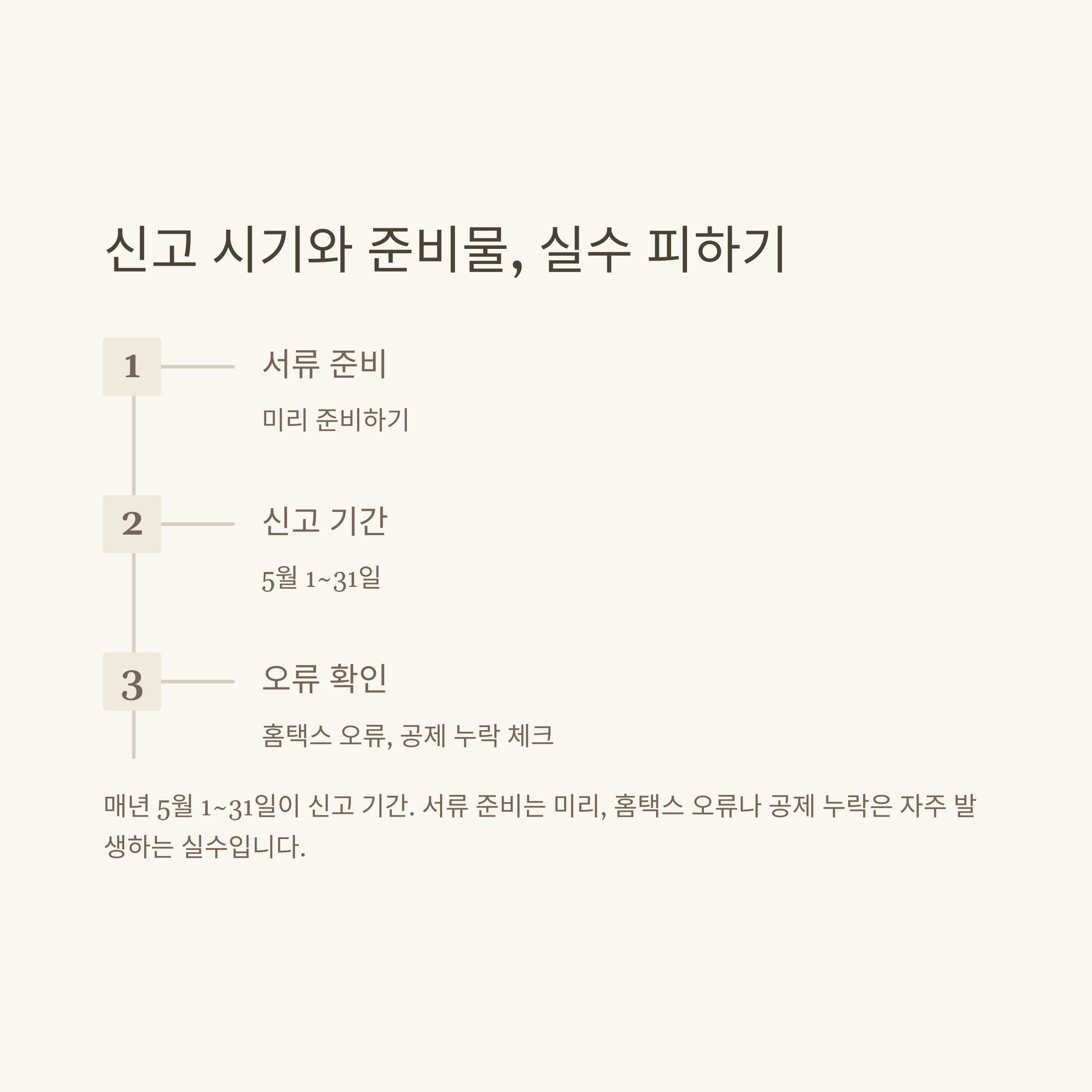 국세청은 자주 하는 실수에 대한 가이드를 별도로 제공하고 있으니 종합소득세 신고 유의사항 페이지도 꼭 참고해 보세요.