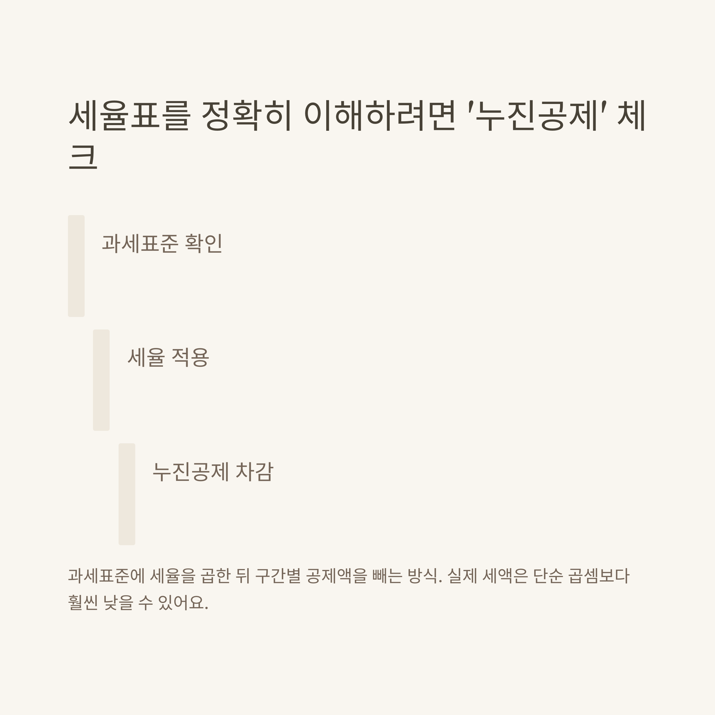 이 표를 보면 알 수 있듯이, 과세표준이 늘수록 세율이 급격히 높아지며, 누진공제 덕분에 그만큼 차감되어 과세되는 구조입니다. 이 때문에 단순히 전체 소득에 세율을 곱하는 게 아니라, 구간별로 계산하고 누진공제를 빼는 방식이 적용됩니다.