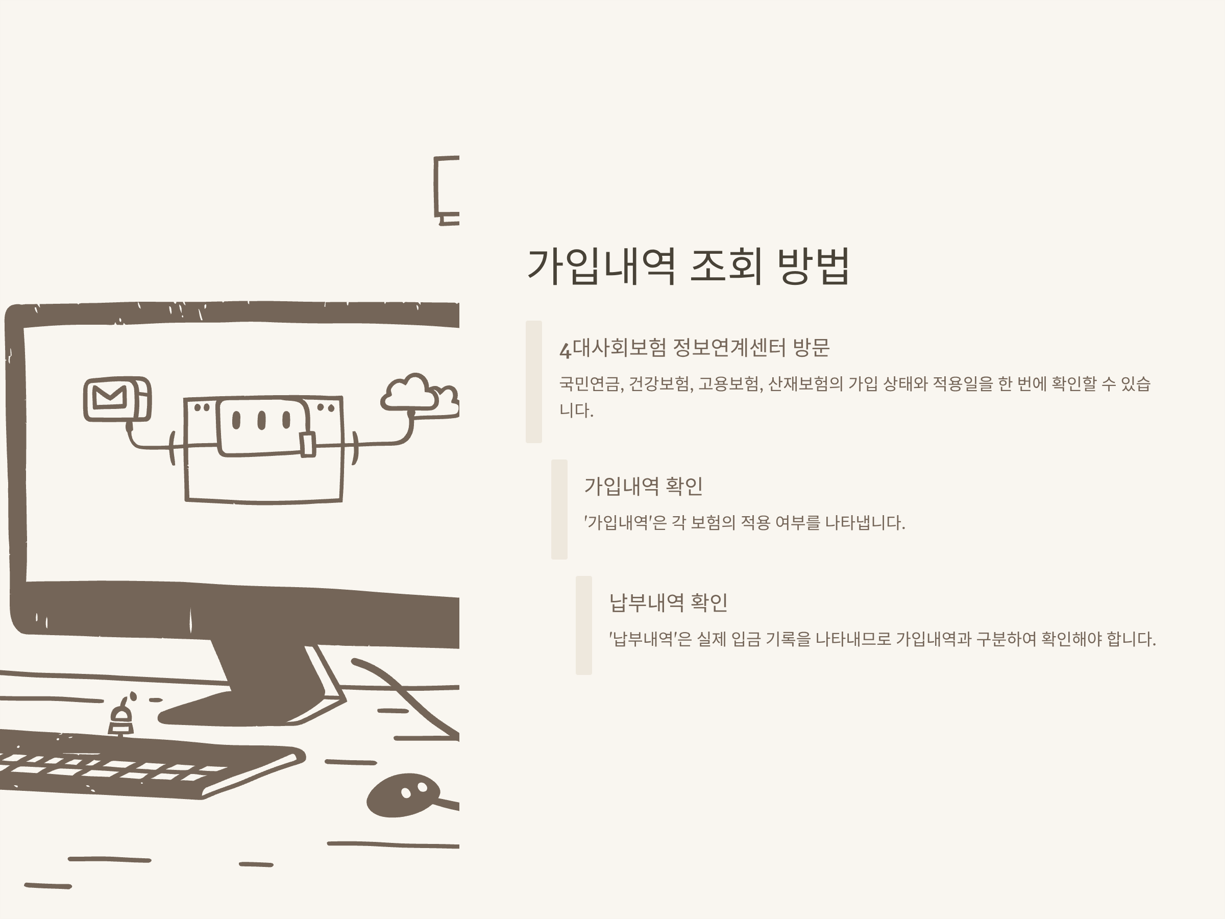 저는 처음에 4대보험 가입내역을 찾으려다 보니 각 기관 사이트를 일일이 방문해야 하는 줄 알았습니다. 그런데 4대사회보험 정보연계센터를 알게 된 후로는 한 번에 확인이 가능했습니다. 이 사이트에서는 국민연금, 건강보험, 고용보험, 산재보험의 가입 여부와 적용 시작일, 소속 사업장 정보를 한 번에 조회할 수 있습니다.