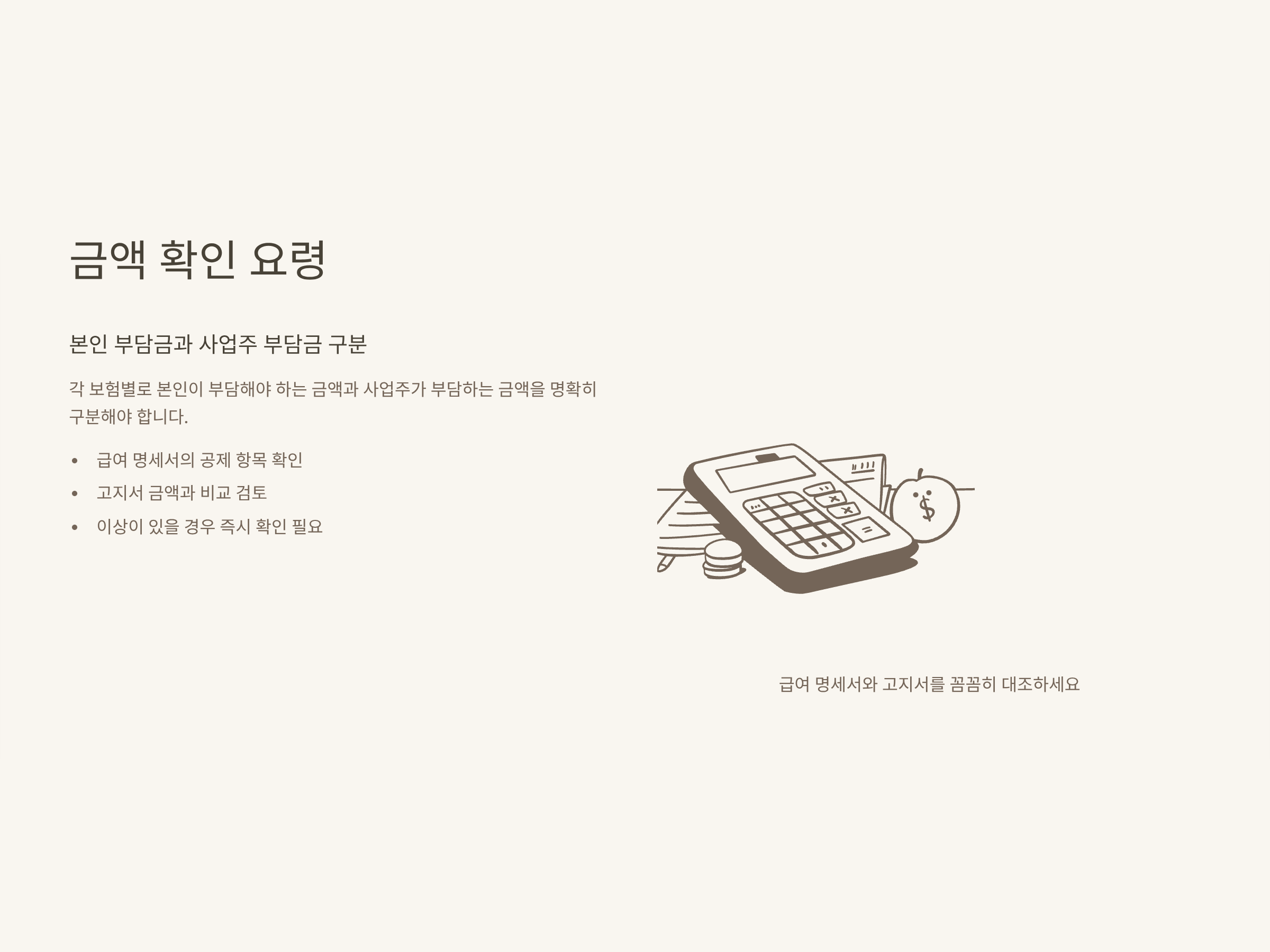 이렇게 퍼센트를 알고 있으면, 월 급여 명세서를 보고 예상 보험료를 미리 계산할 수 있습니다. 저는 급여 명세서의 공제 항목과 실제 고지서 금액을 비교해 차이가 나면 바로 인사팀에 확인 요청을 했습니다. 덕분에 잘못된 부과가 조기 수정된 적도 있었습니다.