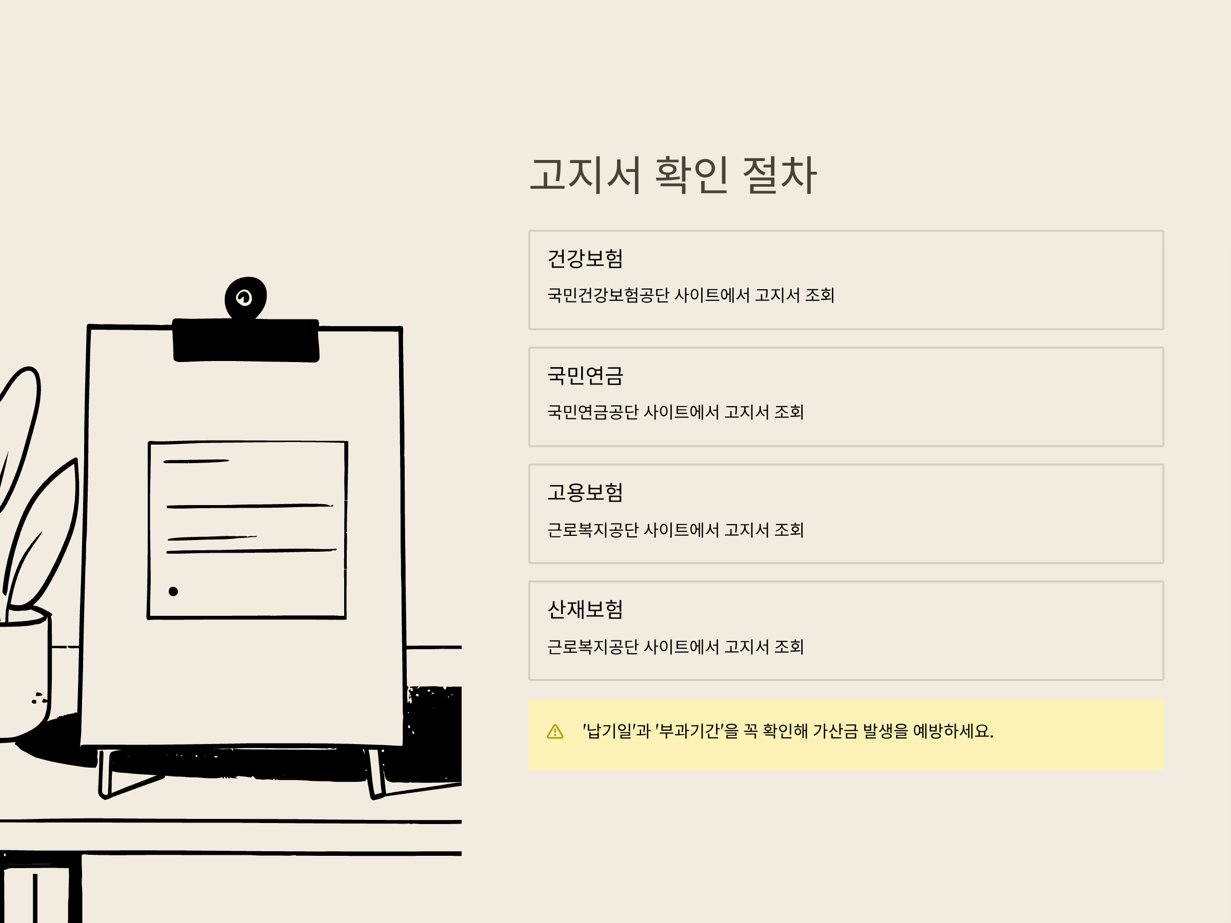 각 기관별 고지서 조회 경로를 보면, 건강보험은 ‘민원여기요’ → ‘보험료 조회/납부’, 국민연금은 ‘내 연금조회’ → ‘보험료 조회’, 고용·산재보험은 ‘보험료 조회/납부’ 메뉴를 이용합니다. 전자고지 신청을 해두면, 우편 지연 없이 바로 확인할 수 있어 편리합니다.