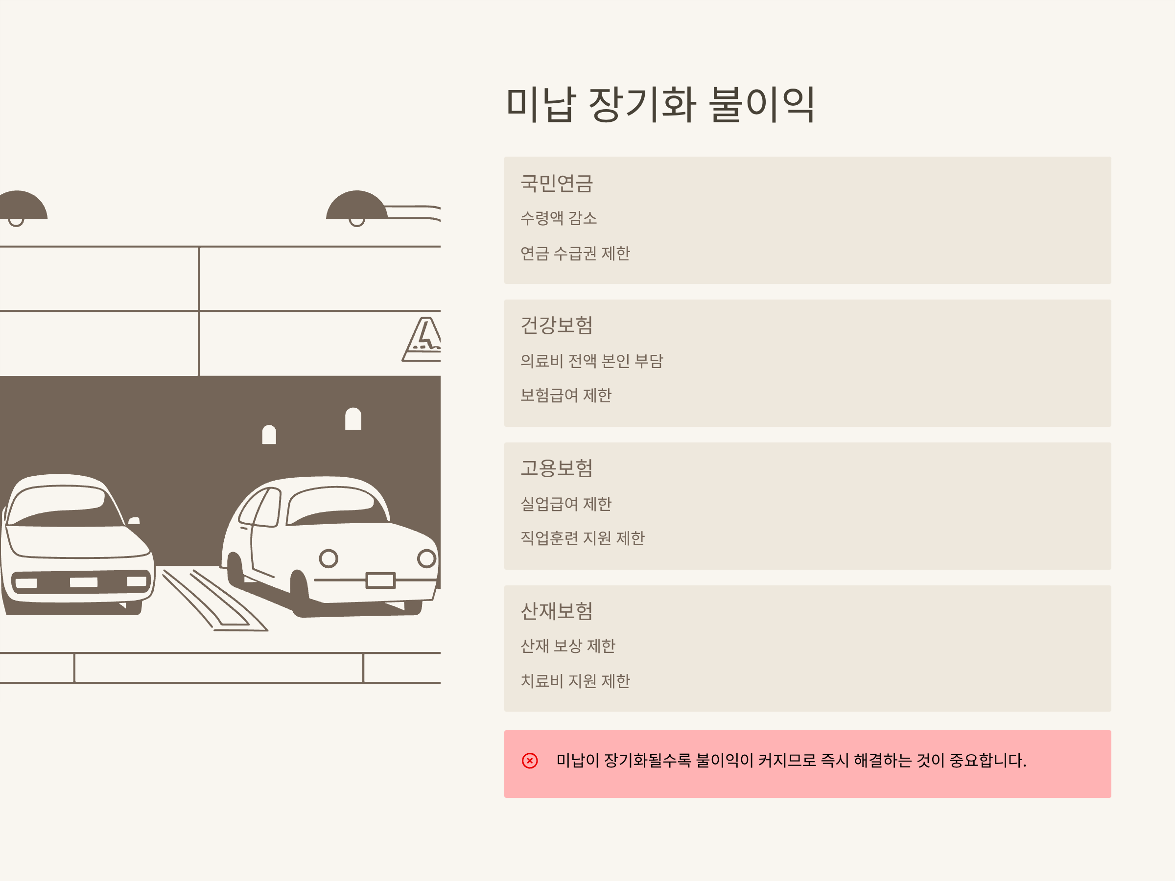 사대보험 미납이 장기화되면 불이익이 큽니다. 제가 아는 지인은 국민연금 미납이 2년 이상 이어져서 나중에 연금 수령액이 대폭 줄었습니다. 건강보험은 장기 체납 시 의료기관 이용 시 전액 본인 부담이 될 수 있고, 고용보험은 실업급여 수급 자격에 영향을 줍니다.
