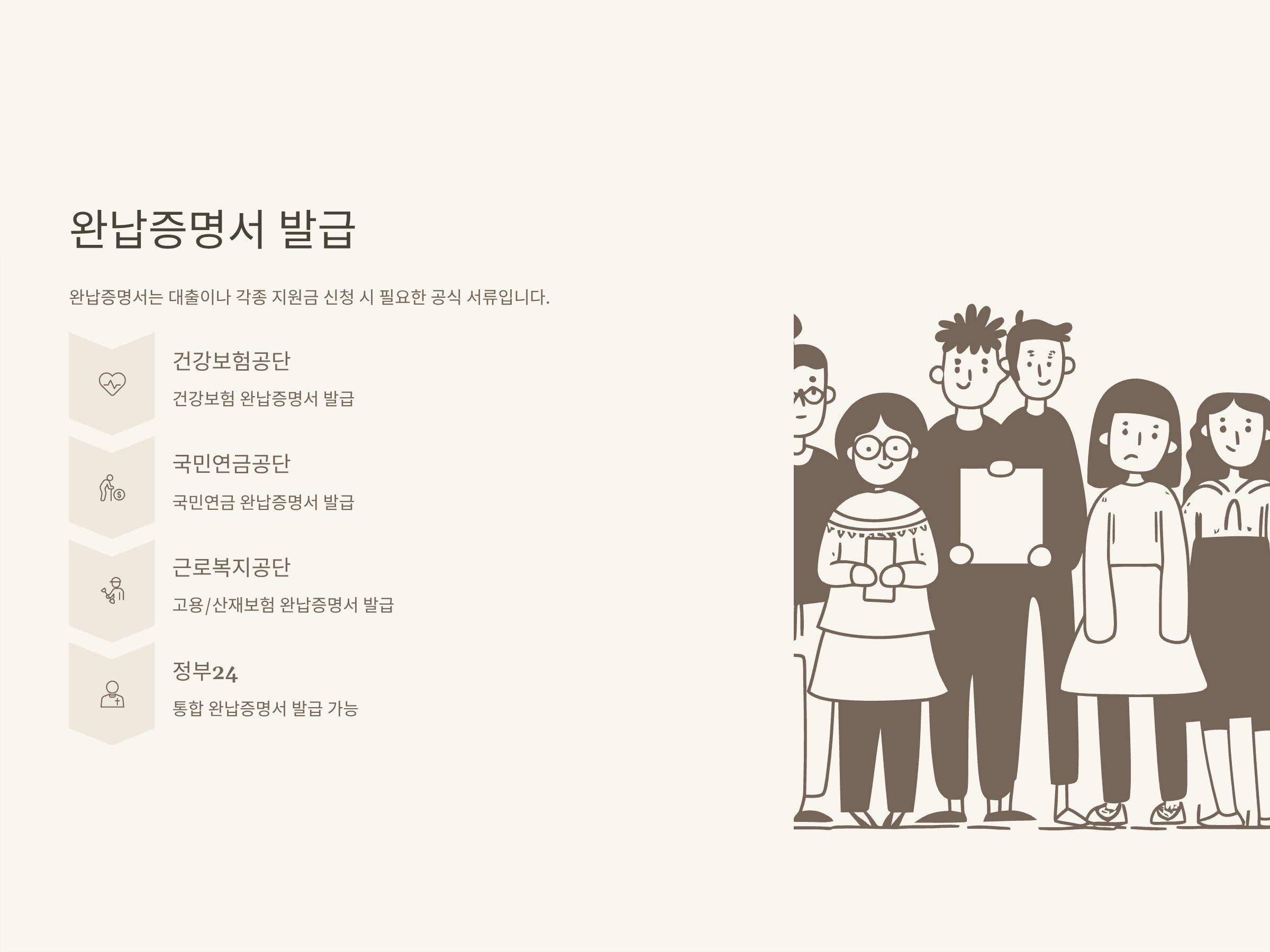 발급 절차는 각 보험기관에서 별도로 진행해야 합니다. 건강보험은 ‘민원여기요’ 메뉴 → ‘보험료 완납증명서 발급’, 국민연금은 ‘증명서 발급’ → ‘보험료 납부확인서’, 고용·산재보험은 ‘증명서 발급’ → ‘보험료 완납증명서’를 선택하면 됩니다. 저는 보통 정부24에서도 통합 발급을 이용하지만, 때때로 각 기관에서 직접 발급해야 하는 경우가 있습니다.
